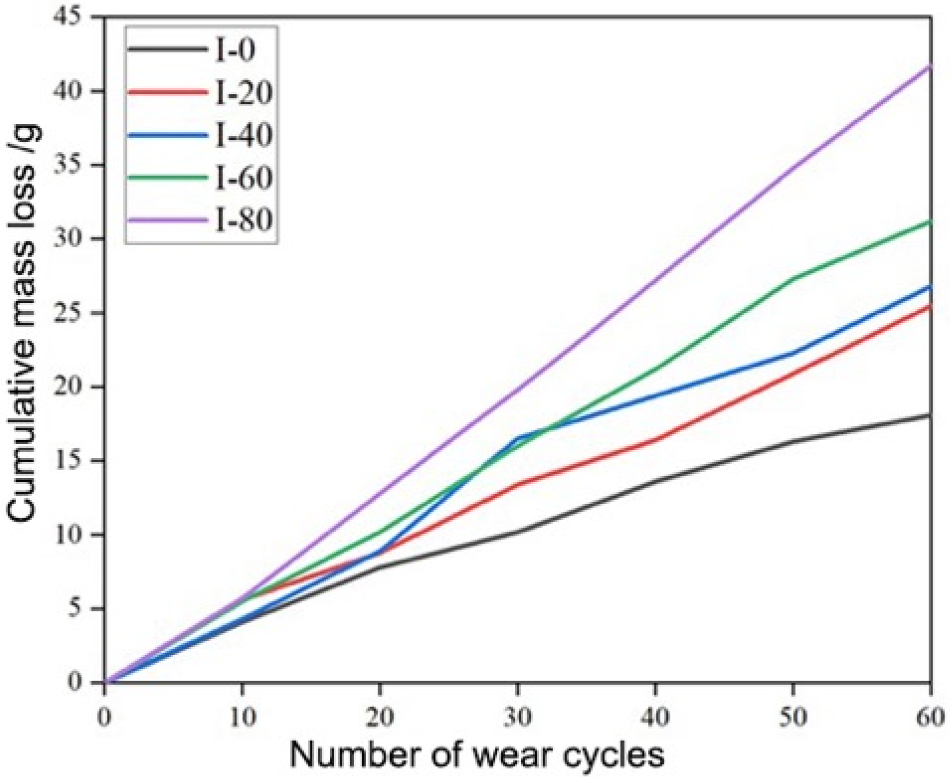 Figure 3. Cumulative mass loss of C40 concrete specimens measured by abrasion testing after repeated impact loading under different numbers of impact cycles (I-0, I-20, I-40, I-60, and I-80).