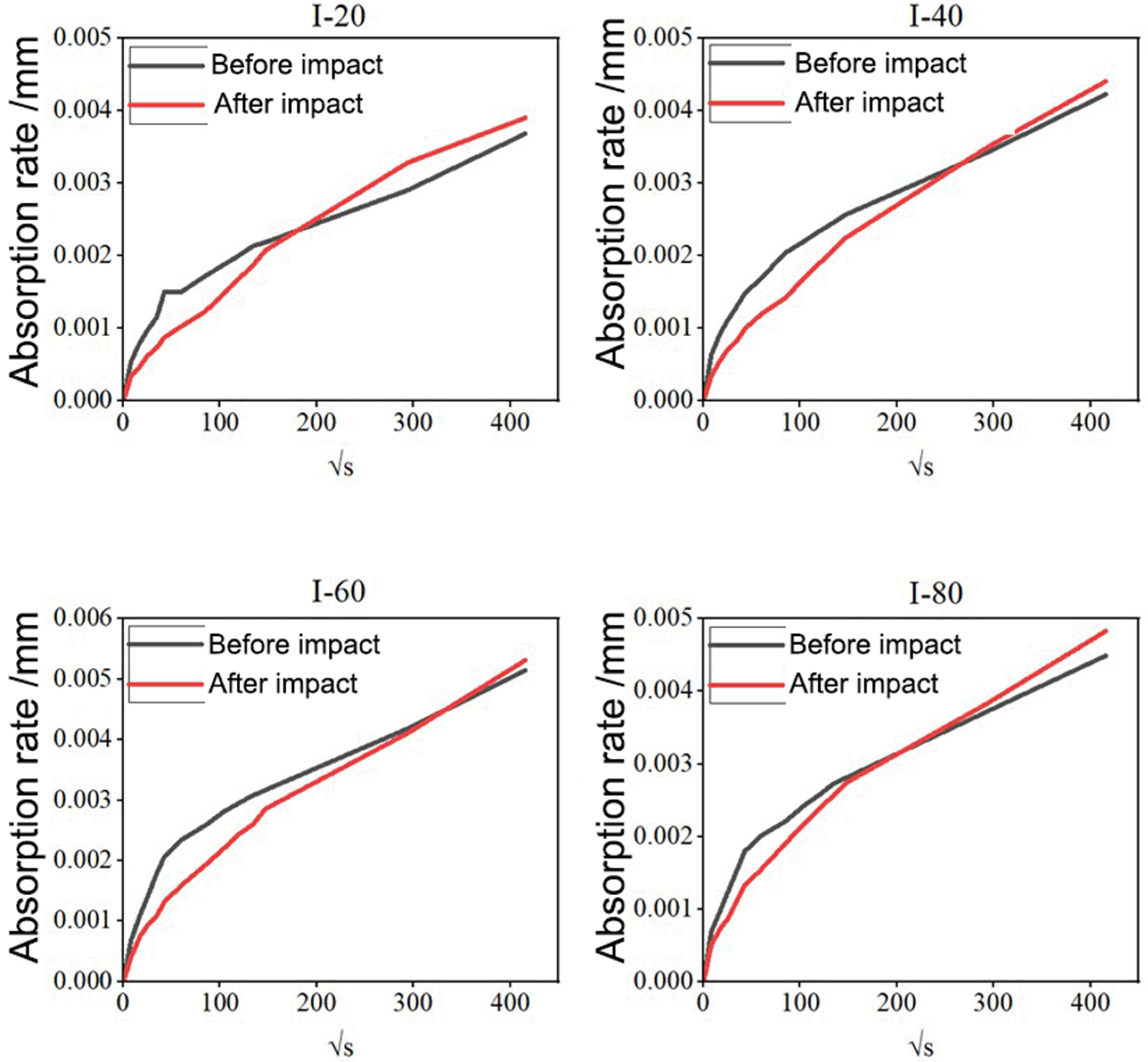 Figure 7. Comparison of water absorption of C40 concrete specimens before impact loading (black) and after repeated impact loading (red) under different numbers of impact cycles (I-20, I-40, I-60, and I-80). The absorption rate was measured using a standardized method, with measurements taken at regular intervals using a high-precision digital caliper and a balance with 0.001 g accuracy.