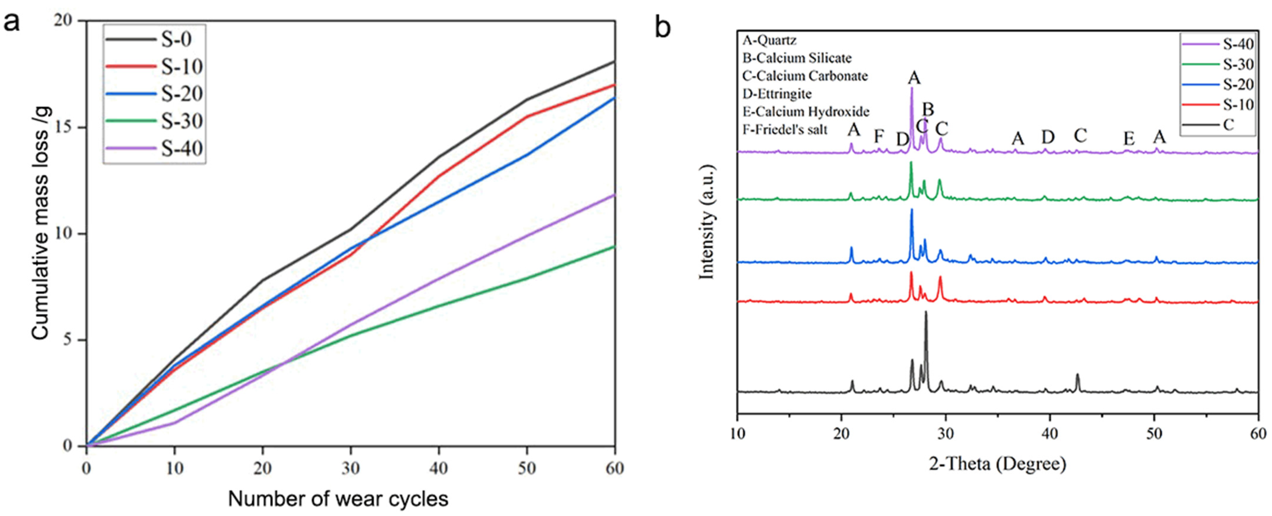 Figure 8. (a) Cumulative mass loss of C40 concrete specimens subjected to different numbers of salt-fog wet–dry cycles (S-0, S-10, S-20, S-30, S-40). (b) XRD spectrum for the identification of crystalline phases of concretes after salt-fog corrosion.