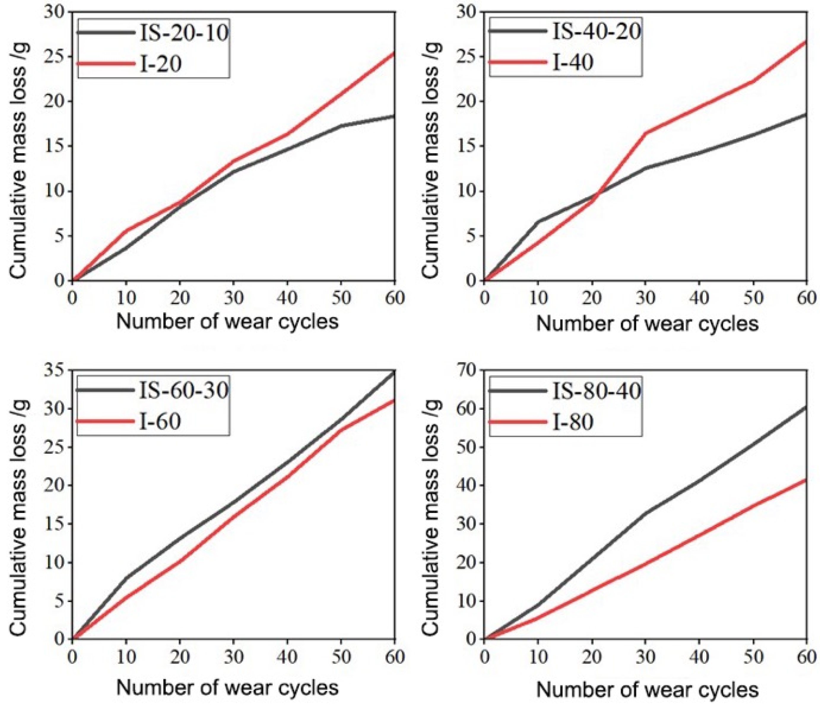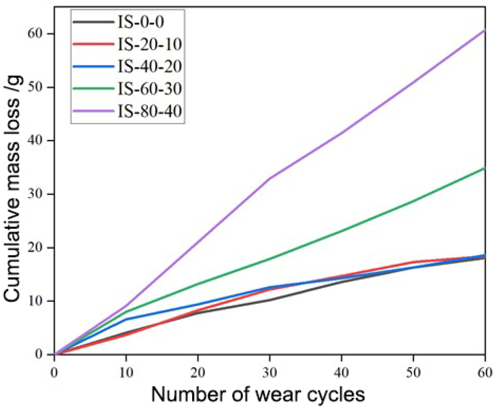 To evaluate the coupled mechanical–chemical degradation of concrete under service-like marine conditions, a combined impact–salt-fog cycling test was designed using C40 concrete specimens. One combined cycle consisted of 20 drop-weight impacts followed by 10 salt-fog wet–dry cycles. Five specimens were prepared and subjected to 0, 1, 2, 3, and 4 combined cycles, respectively, and were labeled IS-0-0, IS-20-10, IS-40-20, IS-60-30, and IS-80-40. After treatment, abrasion tests were performed to determine the cumulative mass loss of each specimen surface, as shown in Figure 10. Moderate combined cycling initially exerted a compensating effect between the two processes. After 20 impact–10 salt-fog cycles and 40 impact–20 salt-fog cycles, the total mass loss after 60 abrasion cycles showed little difference compared with the untreated specimen, suggesting that the beneficial densification effect of salt-fog exposure counterbalanced the micro-damage induced by impact loading. However, when the number of combined cycles increased to 60 impact–30 salt-fog and 80 impact–40 salt-fog, the cumulative mass loss rose sharply, indicating severe deterioration of surface integrity. The wear resistance of concrete decreased markedly under high-frequency impact–corrosion coupling due to progressive cracking, pore coarsening, and loss of surface cohesion.