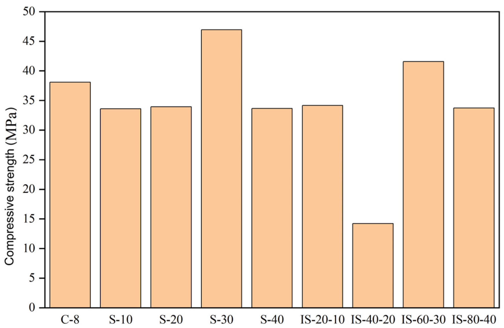 Figure 12. The 28-day compressive strength of C40 concrete specimens under different exposure conditions, including control (C-8), salt fog cycles (S-10, S-20, S-30, S-40), and combined impact–salt fog cycles (IS-20-10, IS-40-20, IS-60-30, IS-80-40).