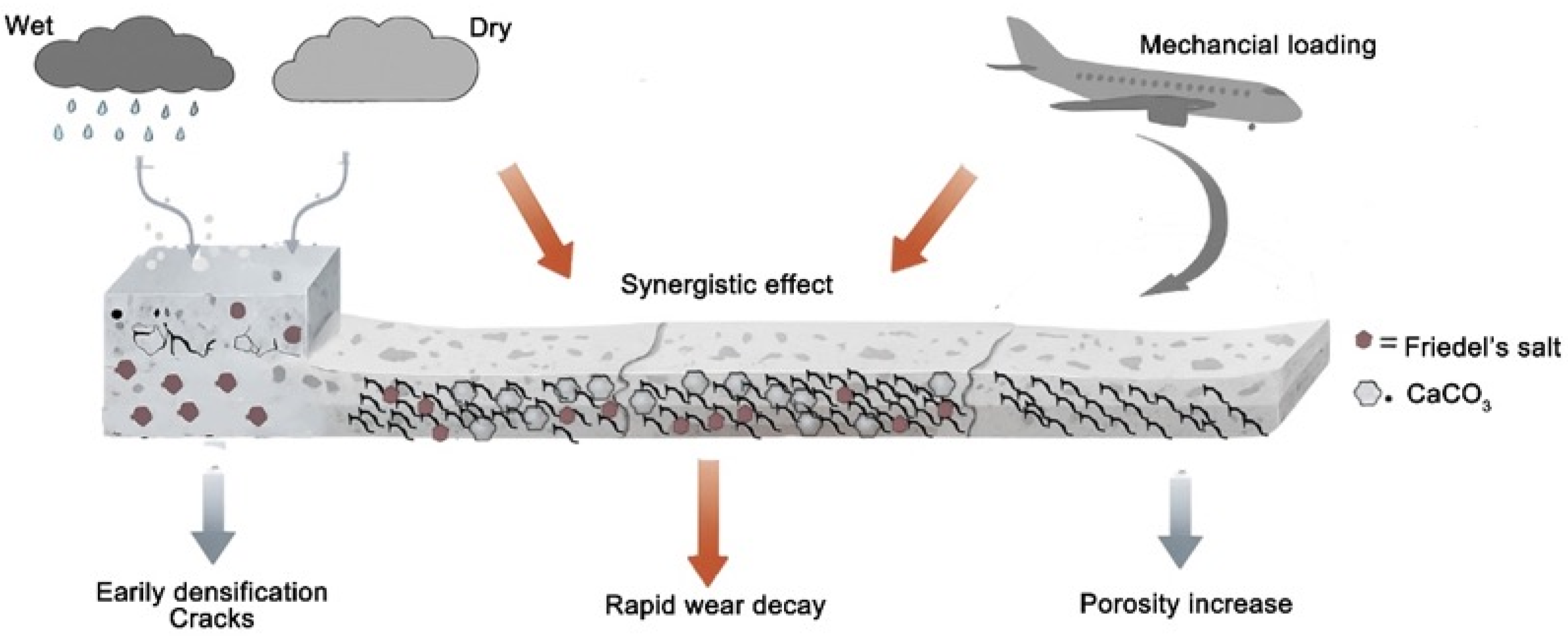 Figure 13. Schematic mechanism of wear-resistance evolution of airport concrete under coupled salt-fog wet–dry cycling and repeated mechanical loading.