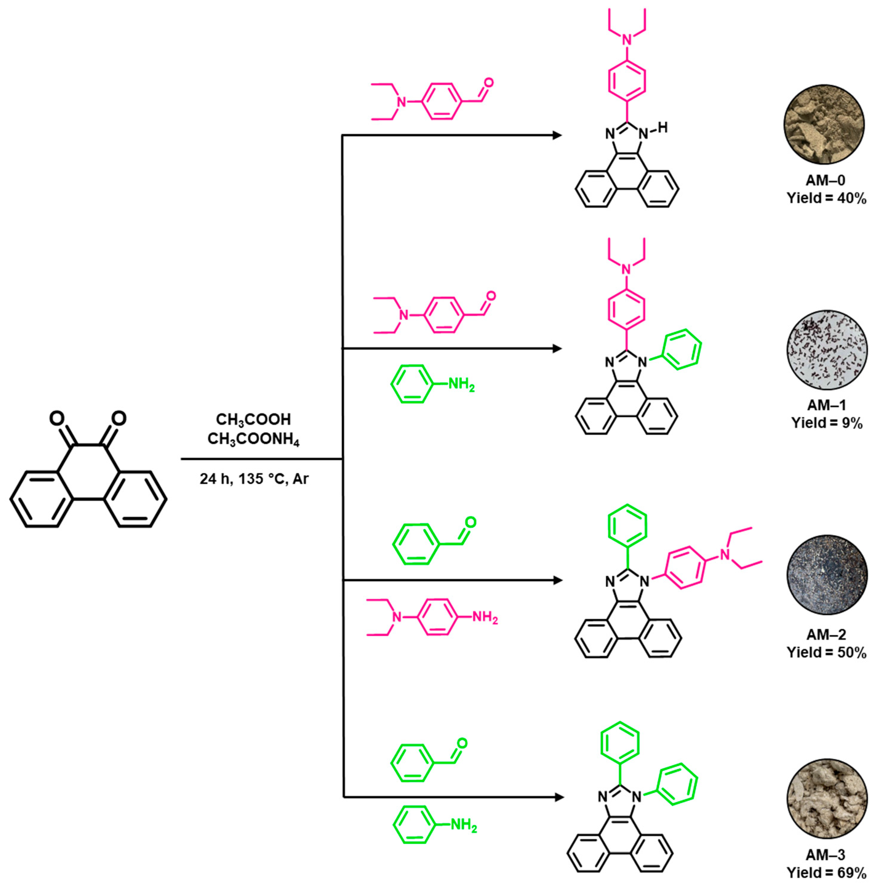 - Liu, C.; Li, J.; Man, X.; Liu, H.; Sun, X.; Liu, F.; Lu, P. Synthesis and Characteristics of Organic Red-Emissive Materials Based on Phenanthro[9,10-d]Imidazole. Chem. Asian J. 2019, 14, 821–827. [Google Scholar] [CrossRef] [PubMed]