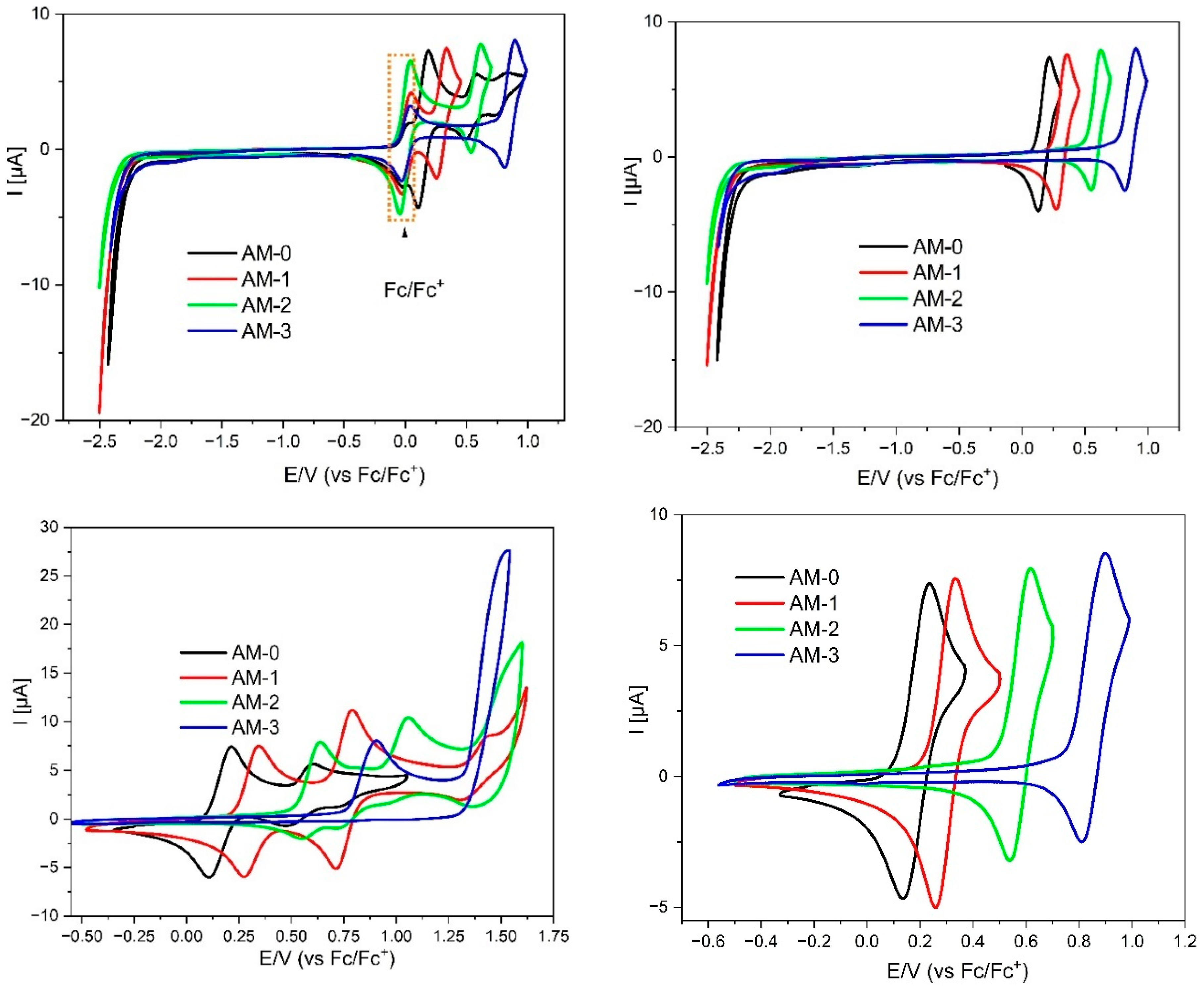 | AM-0 | toluene | 4.18, 5.80, 3.12sh | 289, 348, 380sh | 401, 416 | 53 | 0.28 | - |