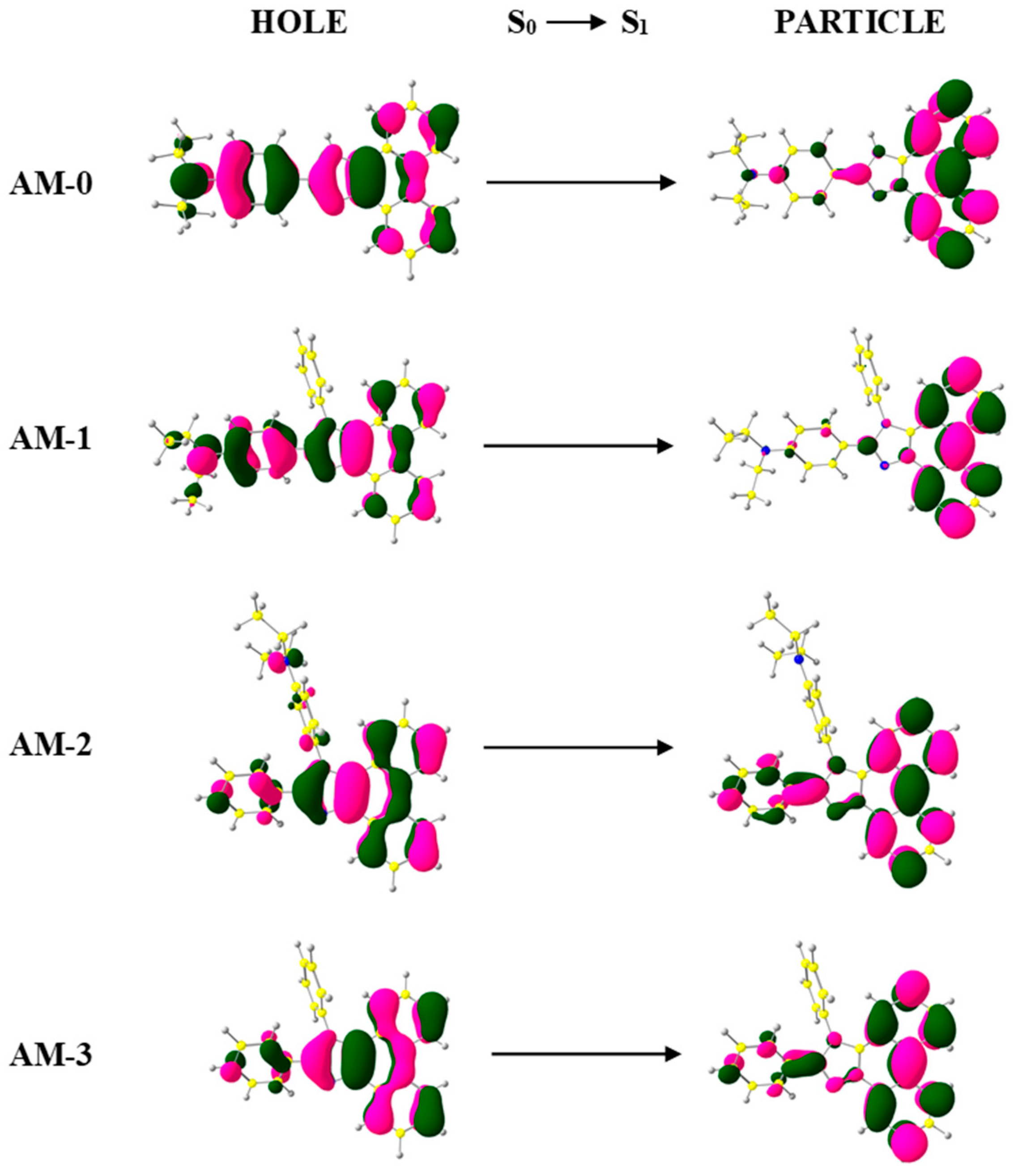 | AM-2 | toluene | 3.79, 2.75, 1.12, 0.99 | 283, 312, 347, 364 | 373, 392, 413 | 9 | 0.20 | - |