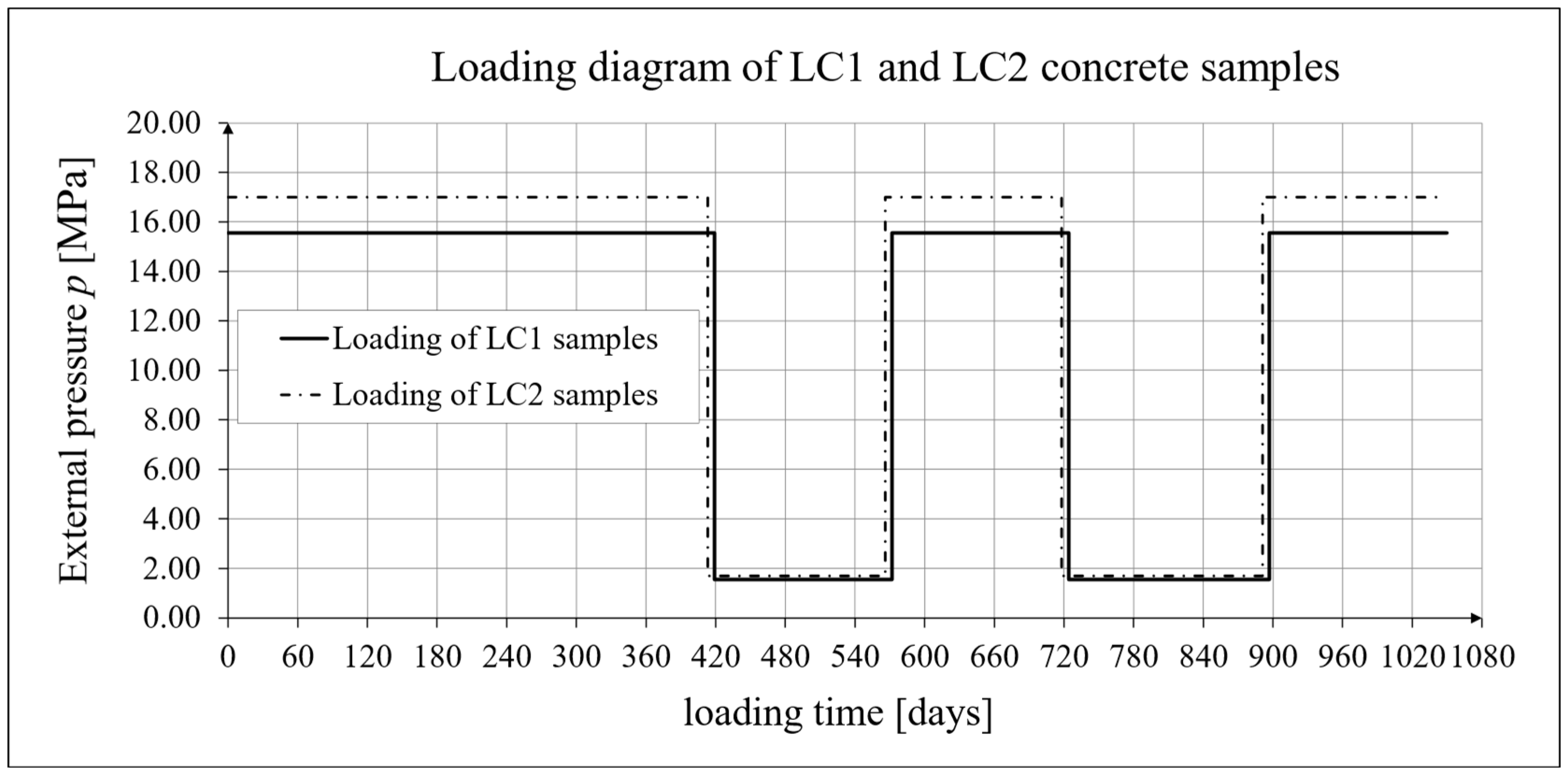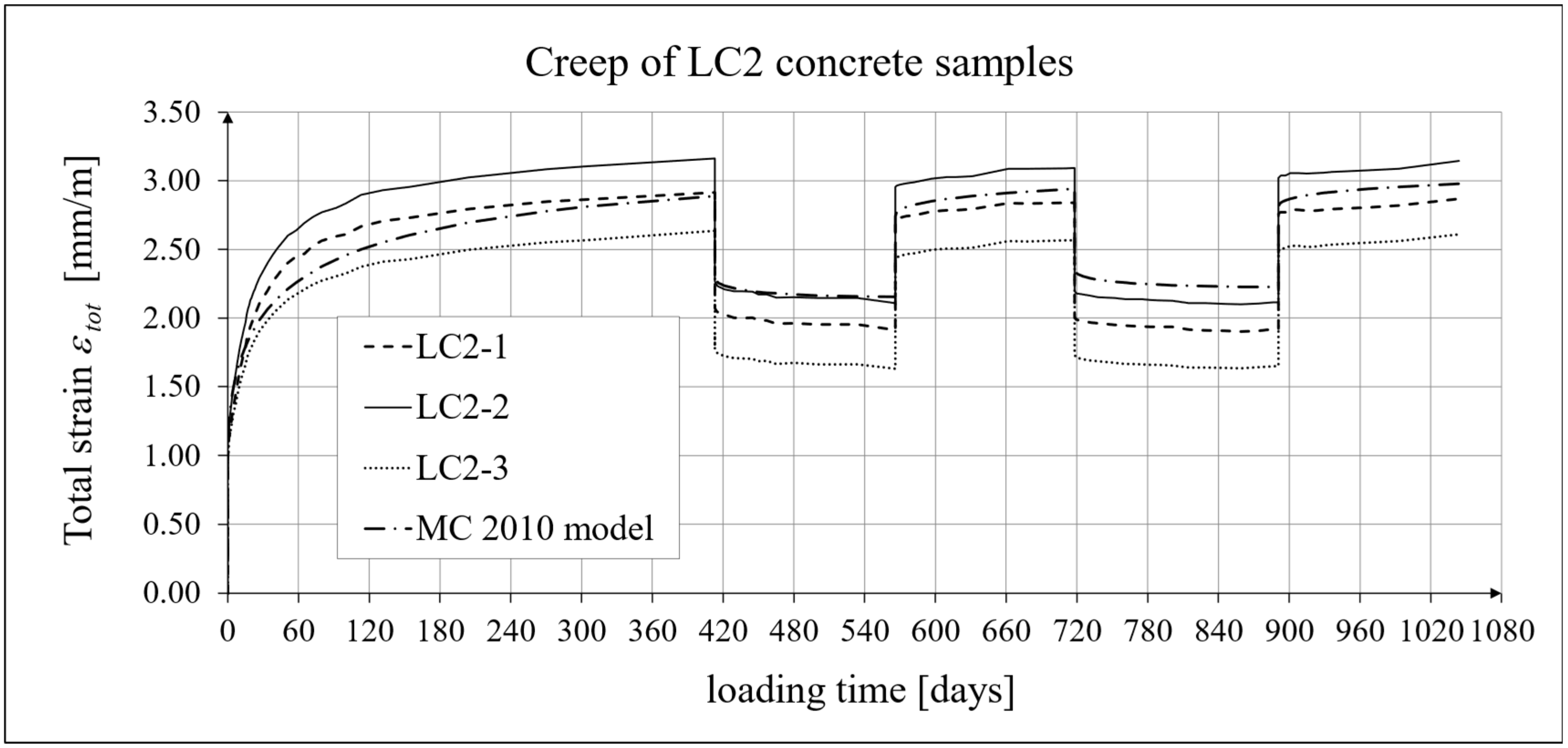 - For concrete made from the LC2 mix, the first loading phase lasted for 413 days at a stress of 16.96 MPa; the first unloading phase at a stress of 1.70 MPa lasted until 566 days after the first load was applied; the second loading phase at 16.96 MPa lasted until 718 days; the second unloading phase at 1.70 MPa lasted until 891 days; and the third loading phase at 16.96 MPa lasted until 1044 days after the first load was applied.