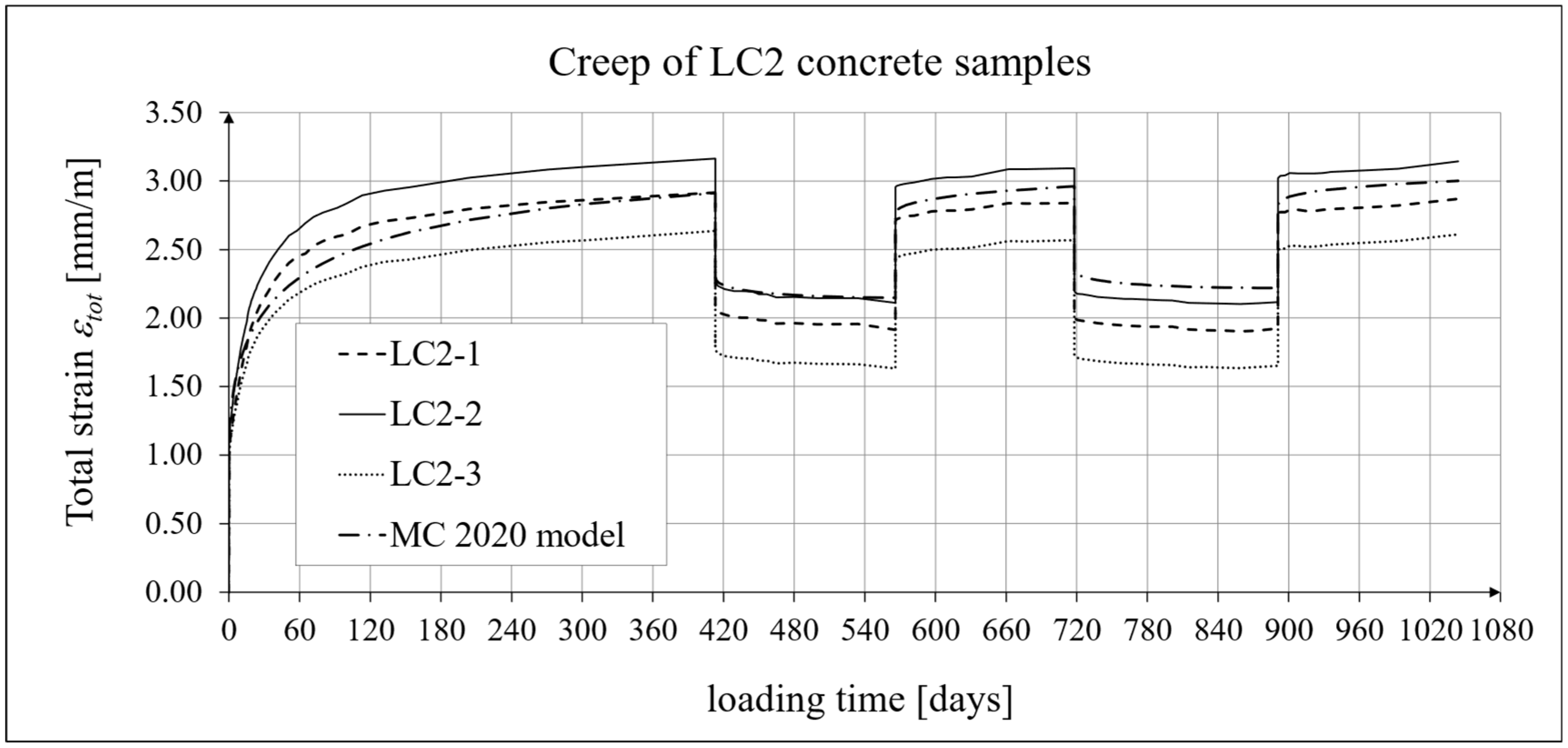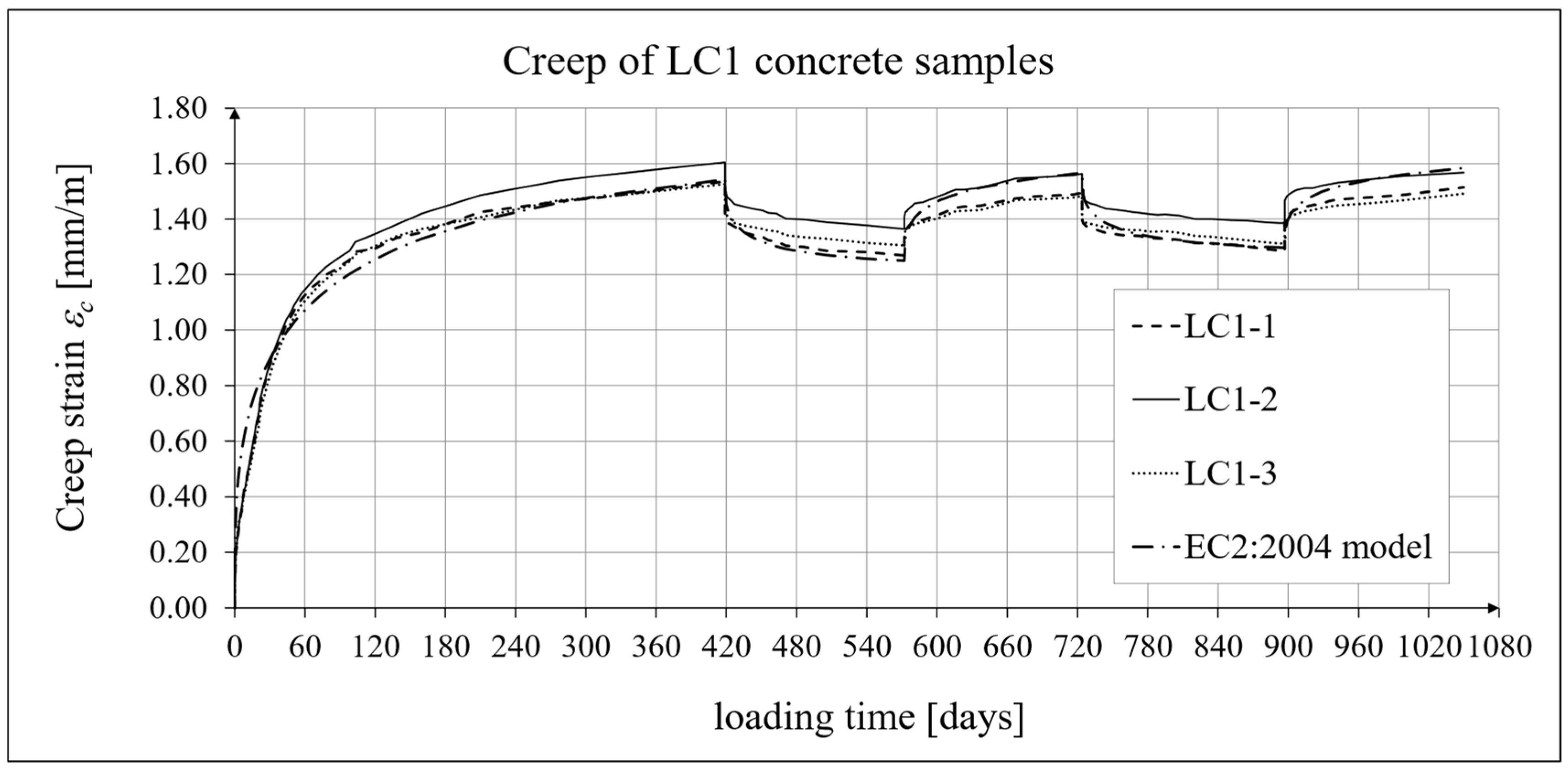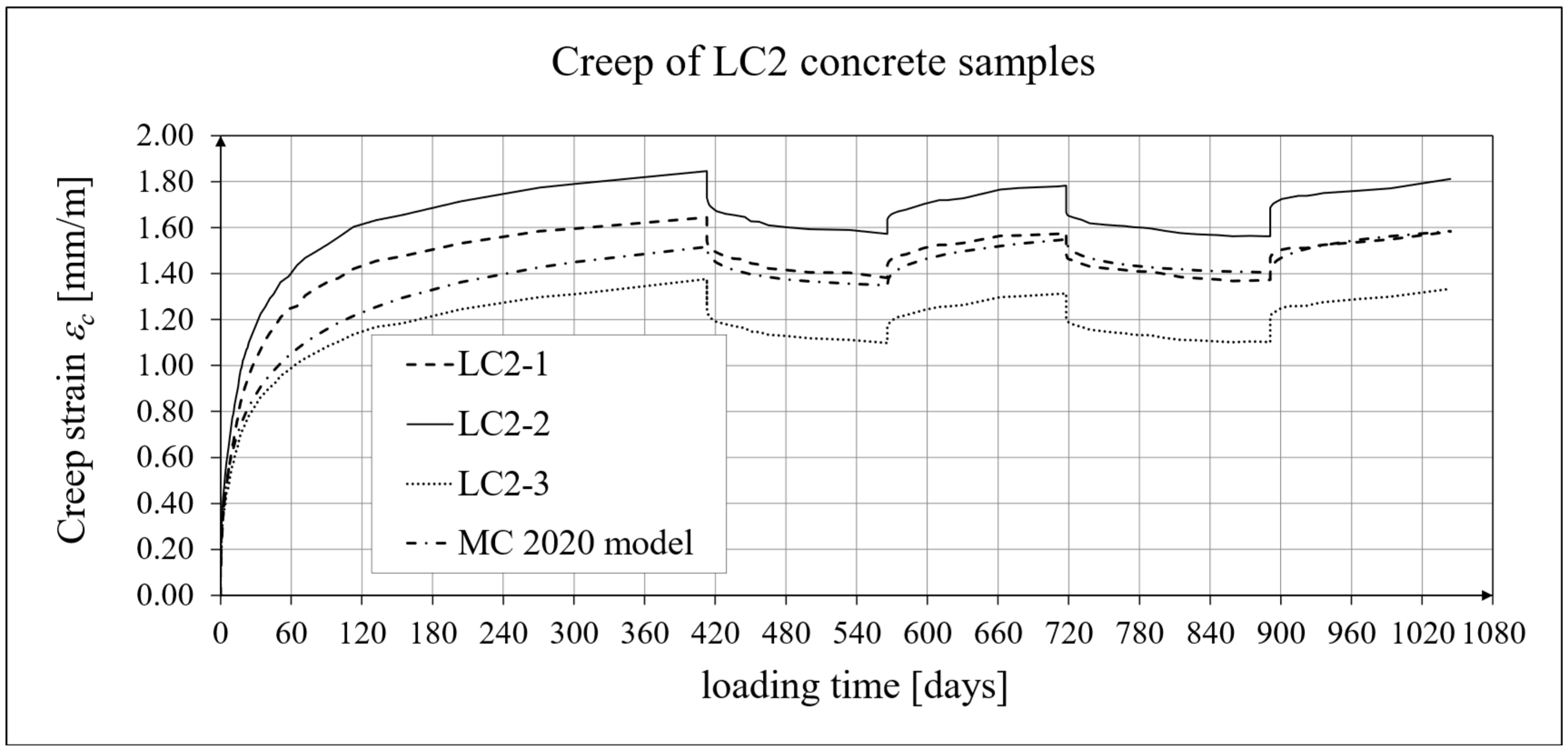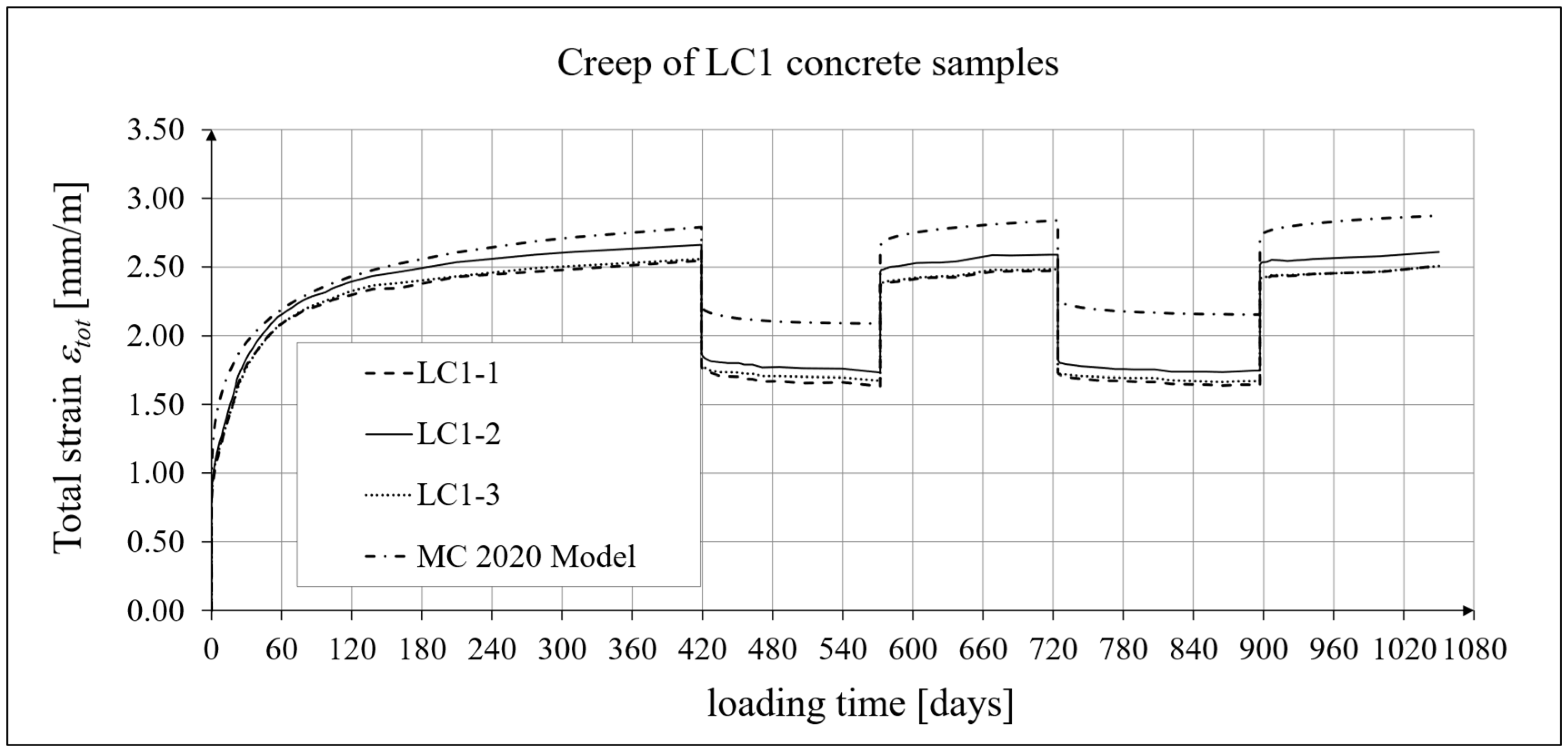 - A limitation of the study was restricted access to creep testing machines—only two machines were available (although the ITB laboratory is equipped with more such devices), which limited the number of samples. Consequently, three samples were used to test the creep of LC1 concrete, and three samples were also used to test the creep of LC2 concrete.