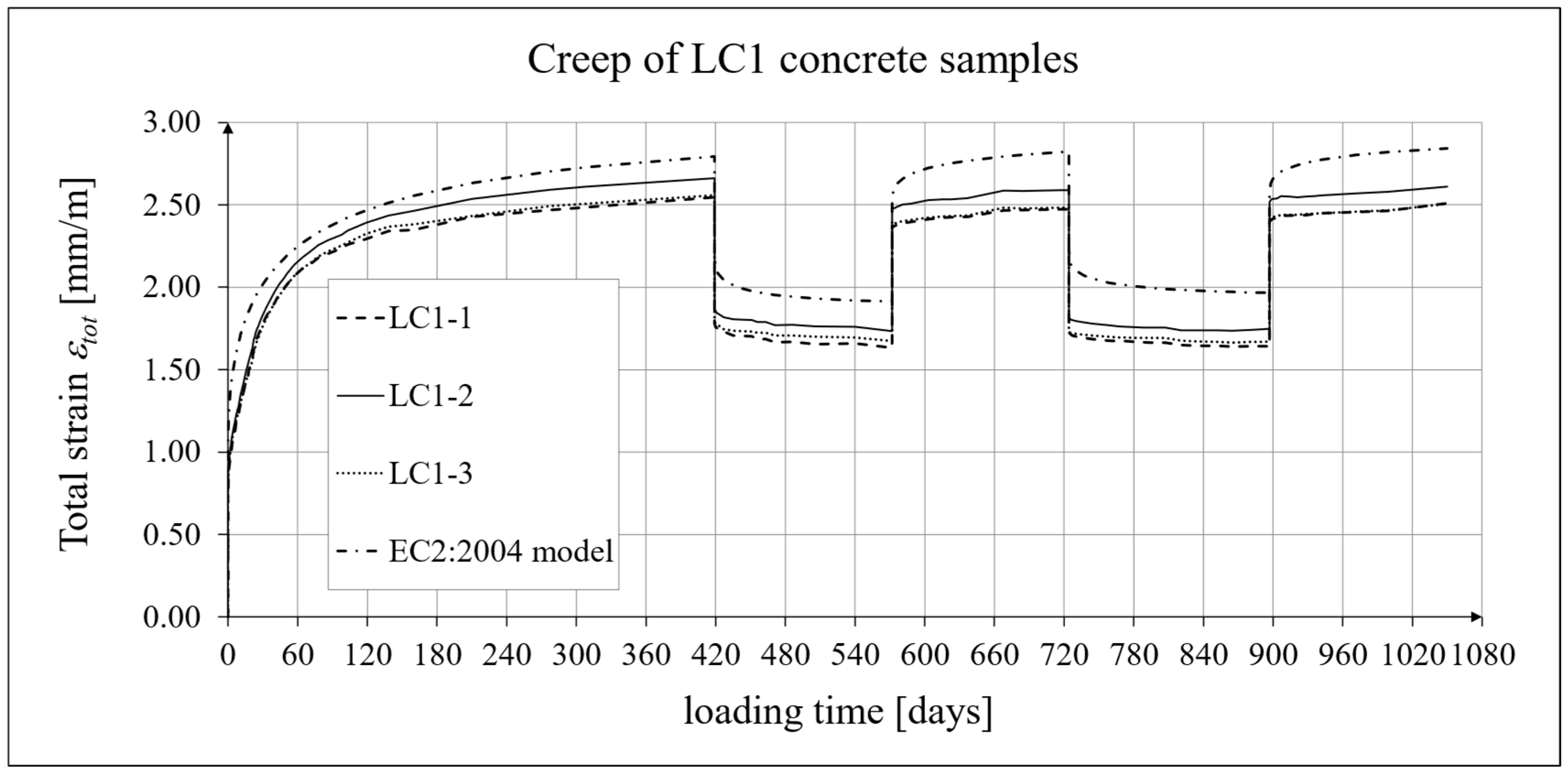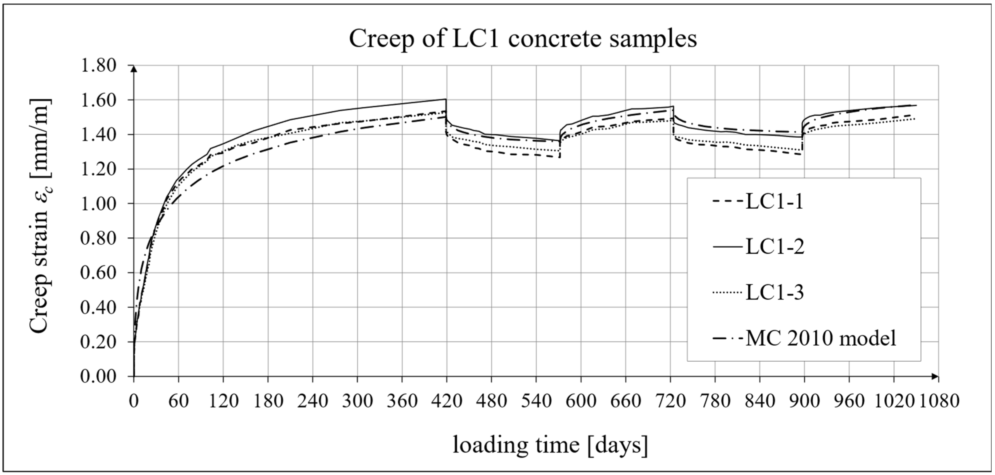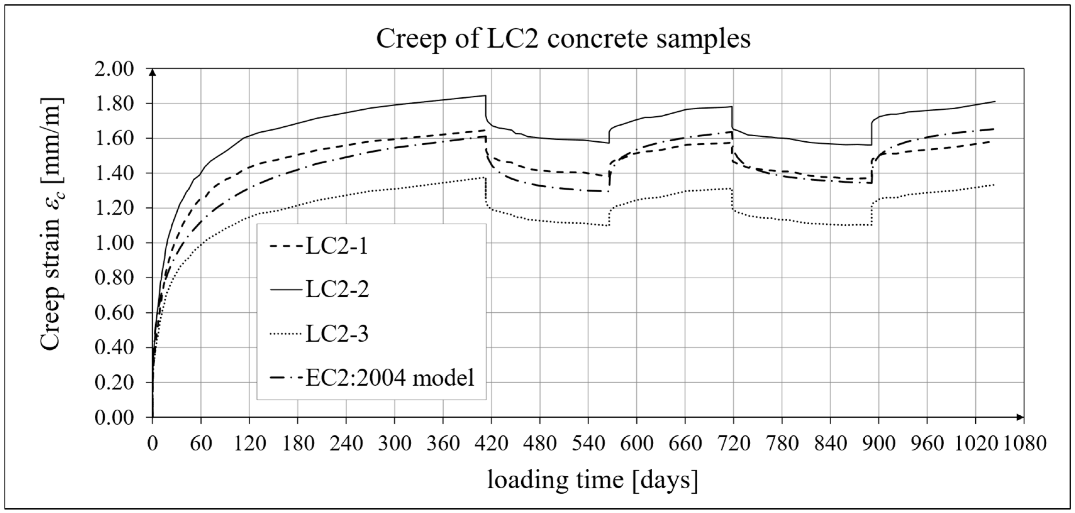 - A limitation of the study was restricted access to creep testing machines—only two machines were available (although the ITB laboratory is equipped with more such devices), which limited the number of samples. Consequently, three samples were used to test the creep of LC1 concrete, and three samples were also used to test the creep of LC2 concrete.