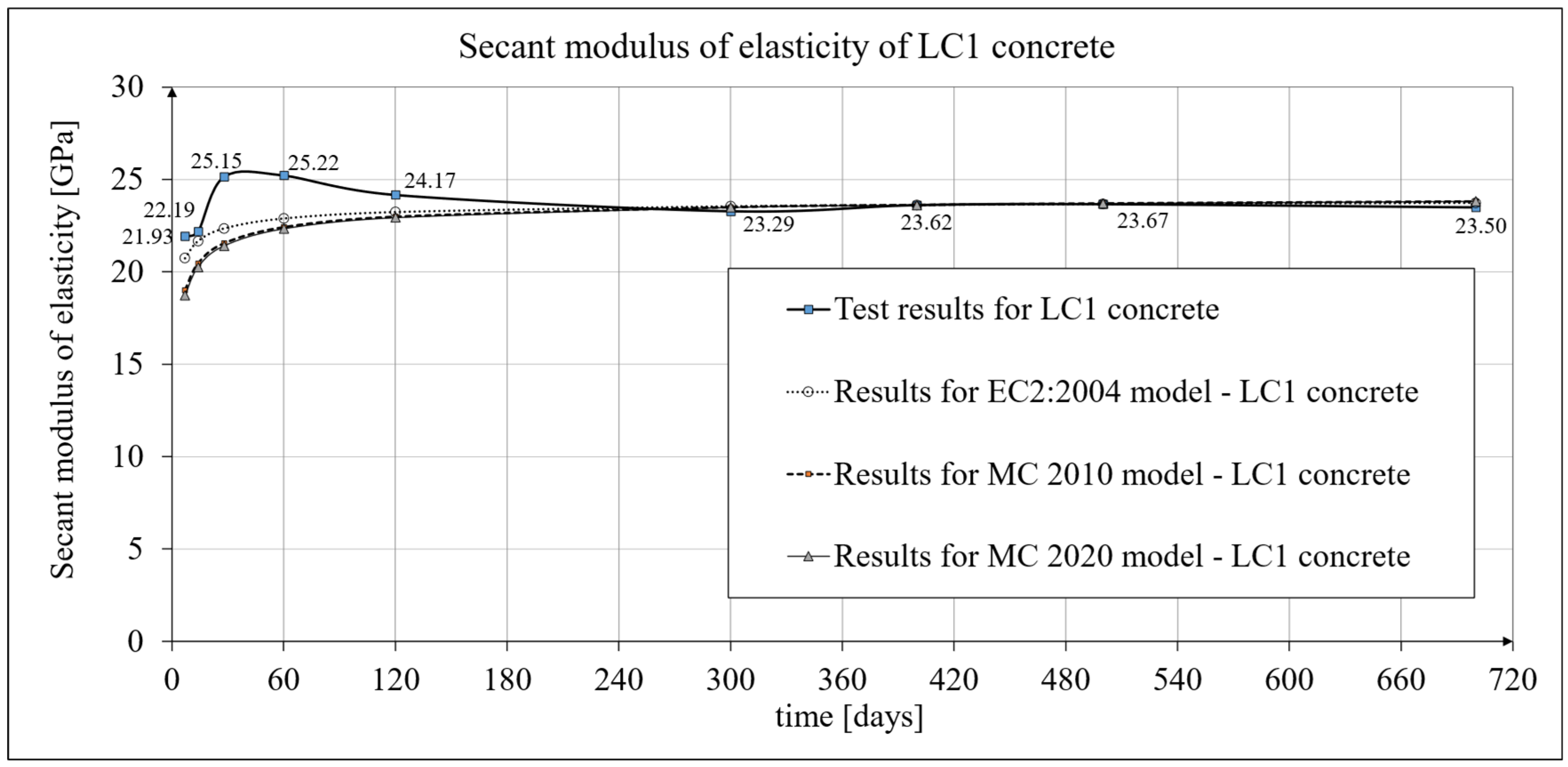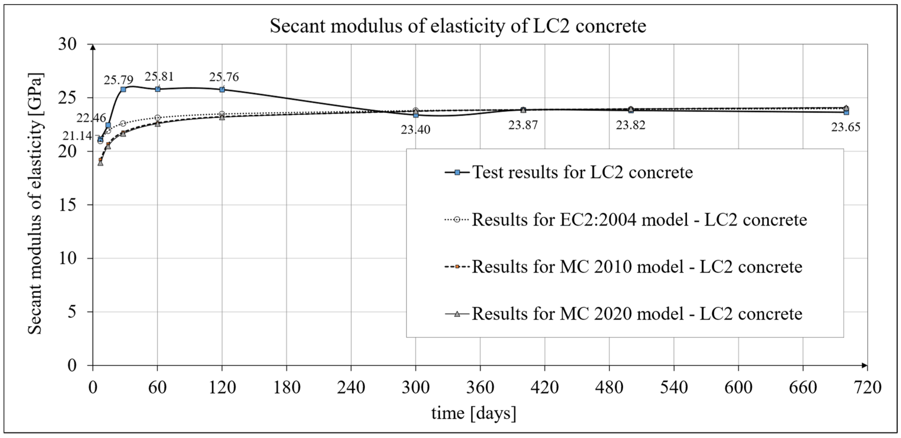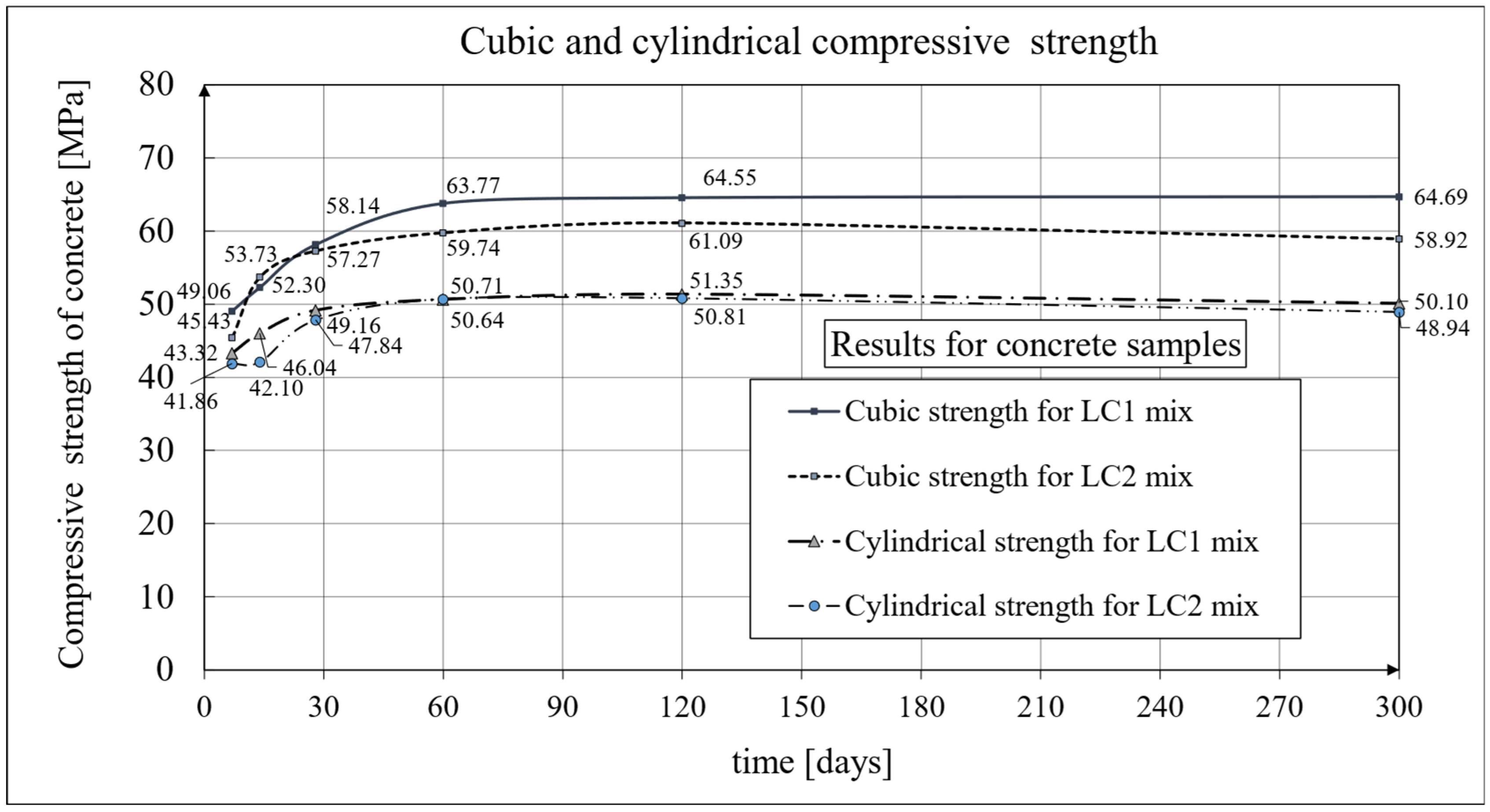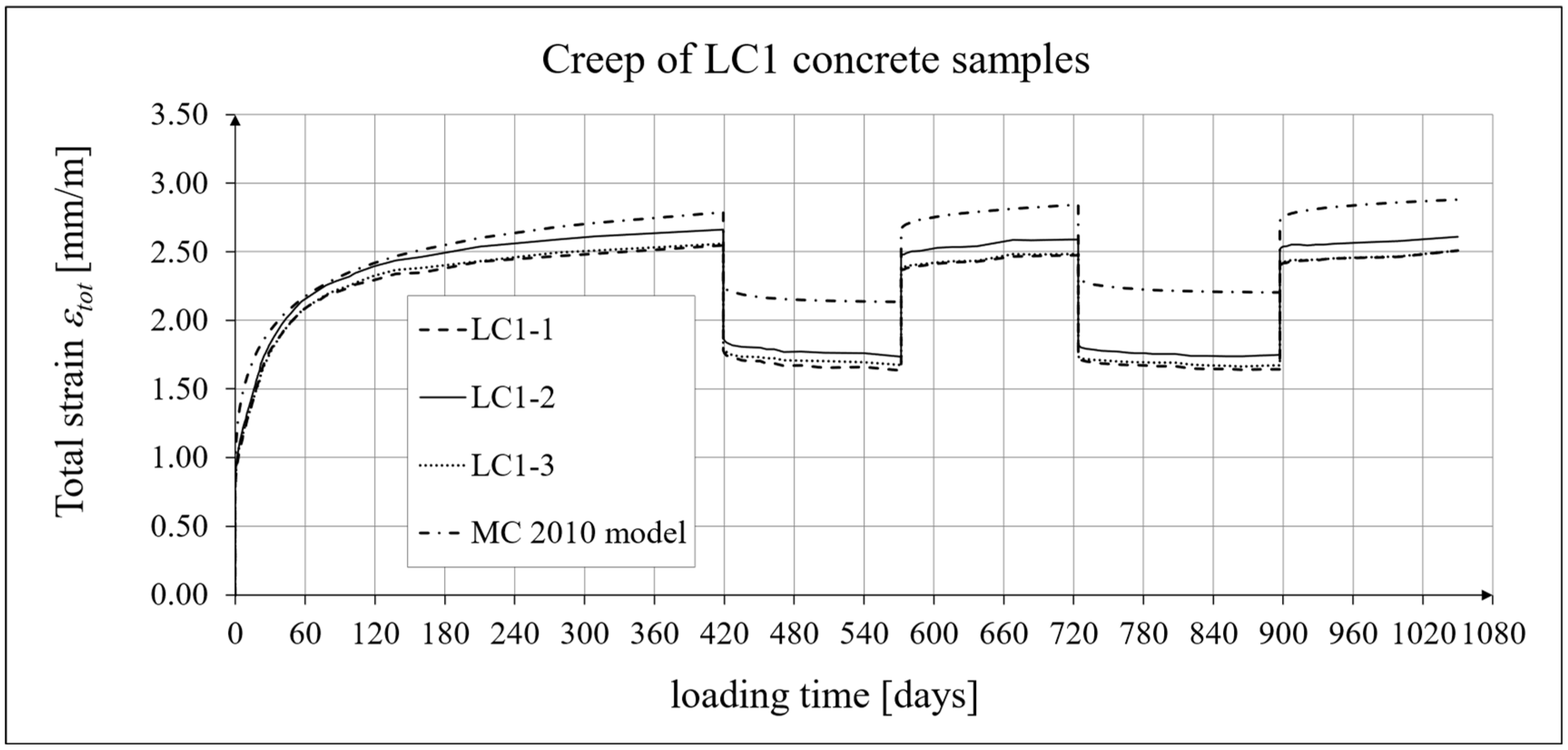 - A limitation of the study was restricted access to creep testing machines—only two machines were available (although the ITB laboratory is equipped with more such devices), which limited the number of samples. Consequently, three samples were used to test the creep of LC1 concrete, and three samples were also used to test the creep of LC2 concrete.