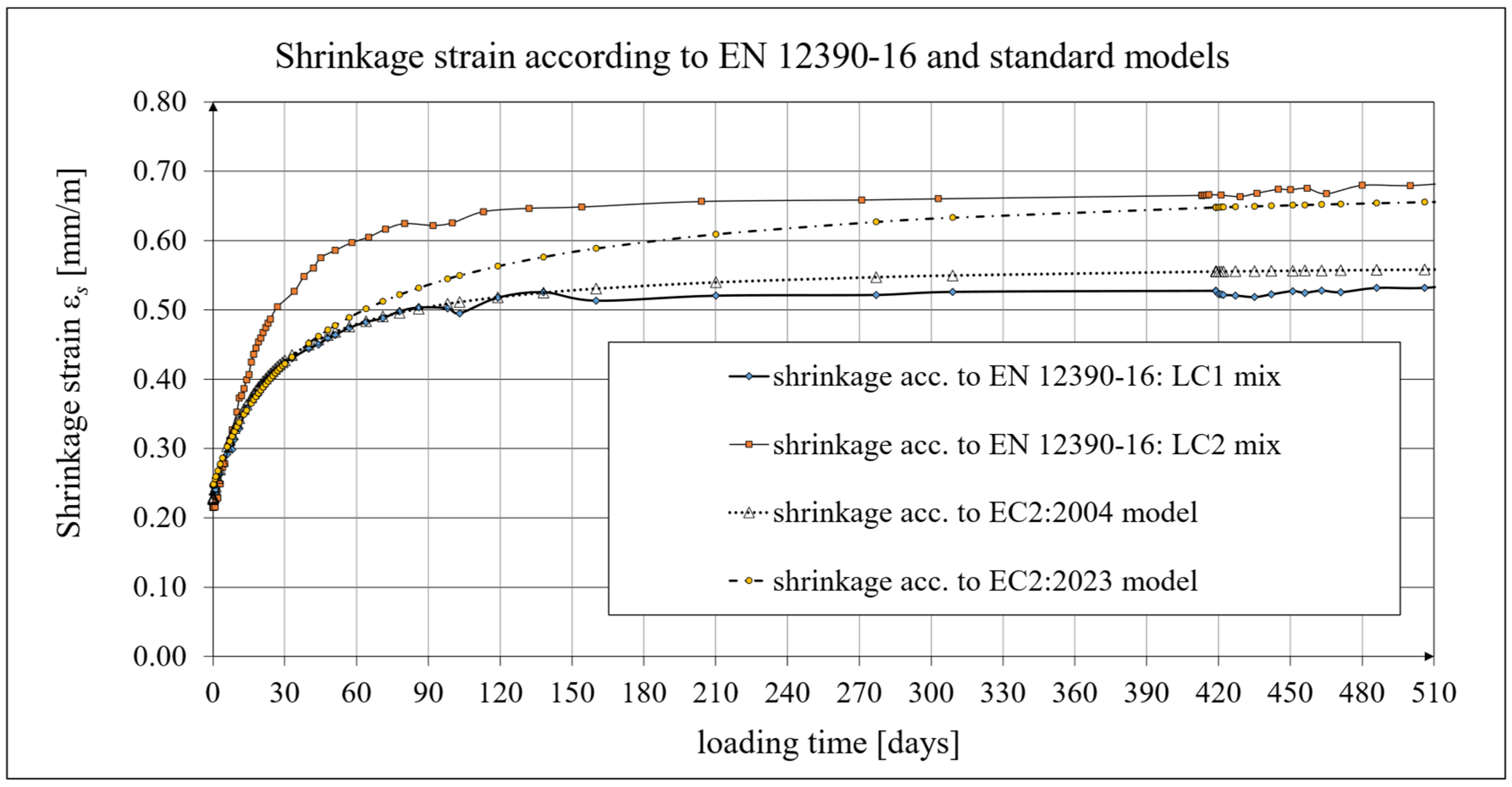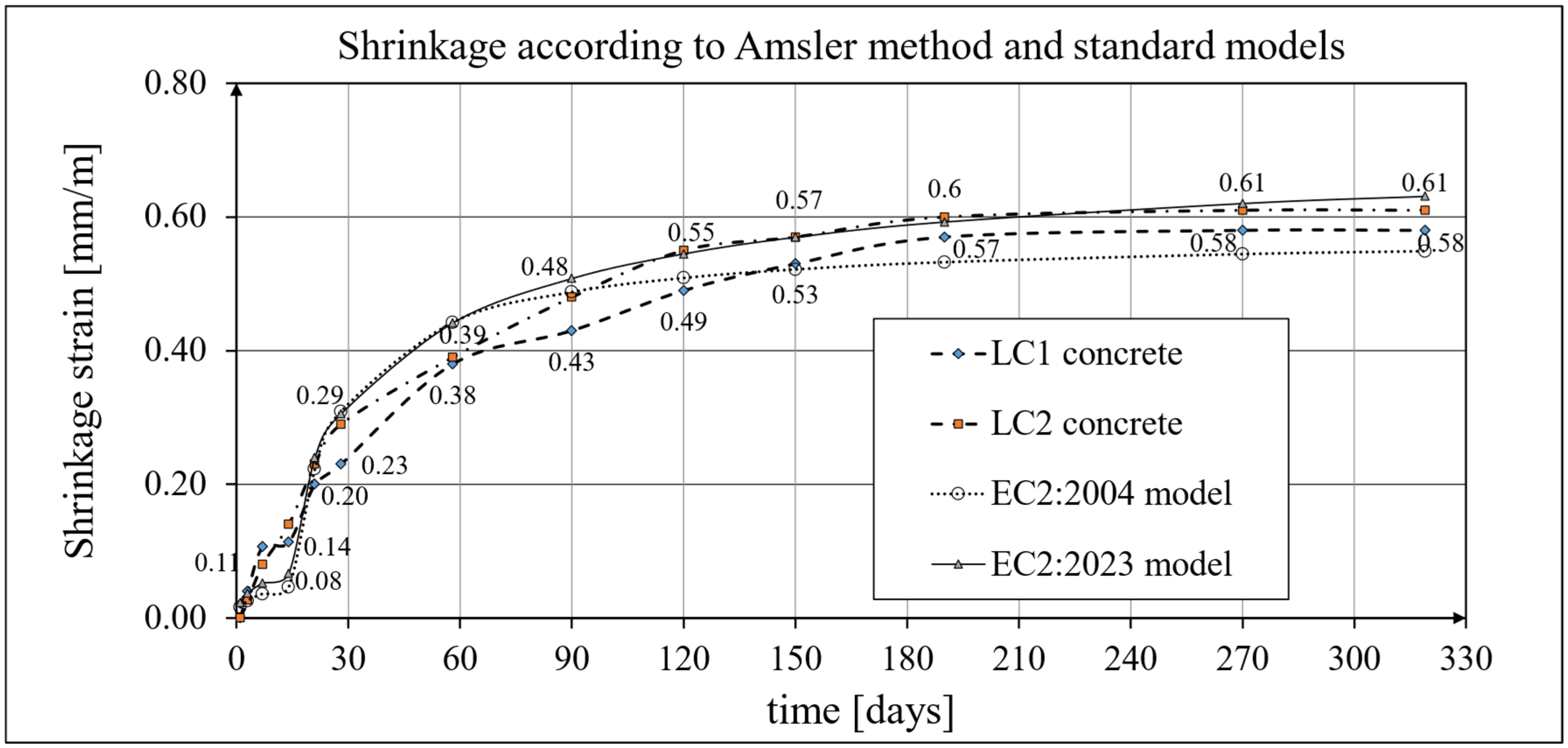- A limitation of the study was the relatively large scatter in the shrinkage results for the LC2 concrete mix, tested in accordance with the European standard, which was caused by variations in the moisture content of the aggregate used in the production of this concrete mix (the mix production took place outside the ITB laboratory).