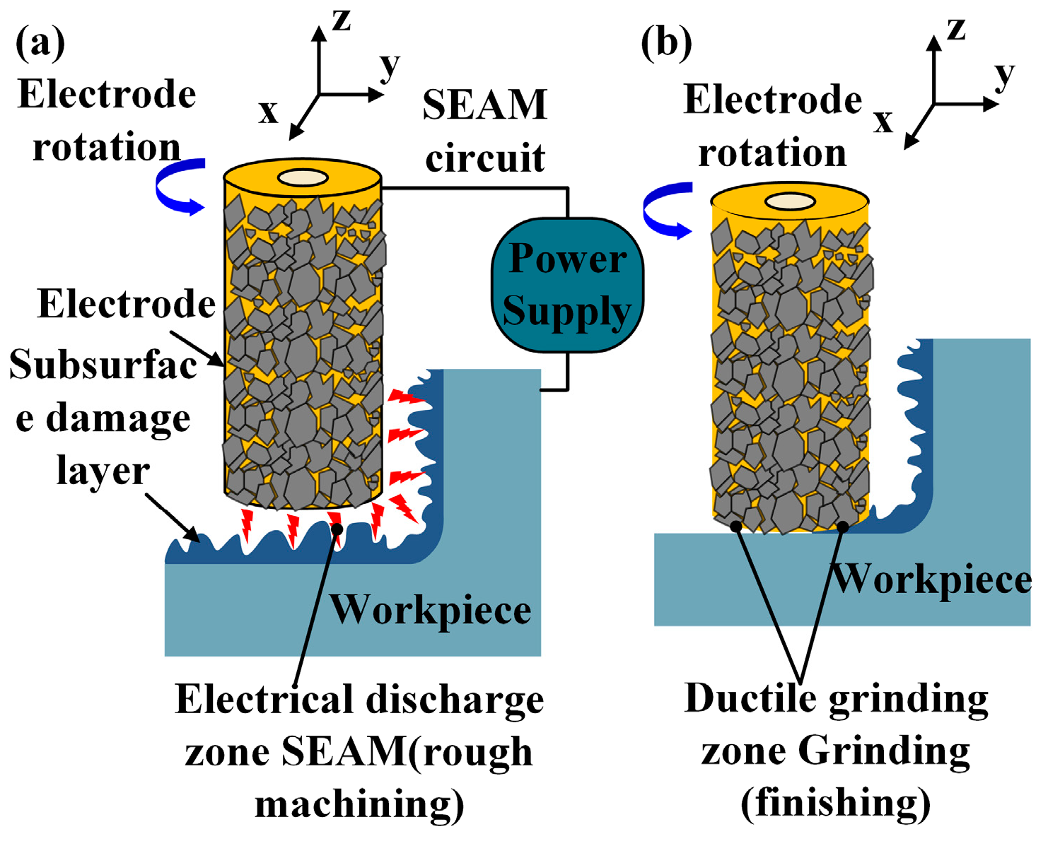 Short electric arc machining grinding is not a simple combination of two processes but rather utilizes the “cold working” characteristics of mechanical grinding to dynamically regulate and correct the “hot working” effects of micro-arc processing. This achieves synergistic enhancement through “thermal–mechanical” composite processing, providing an effective strategy for addressing thermal damage issues in high-energy beam surface processing.