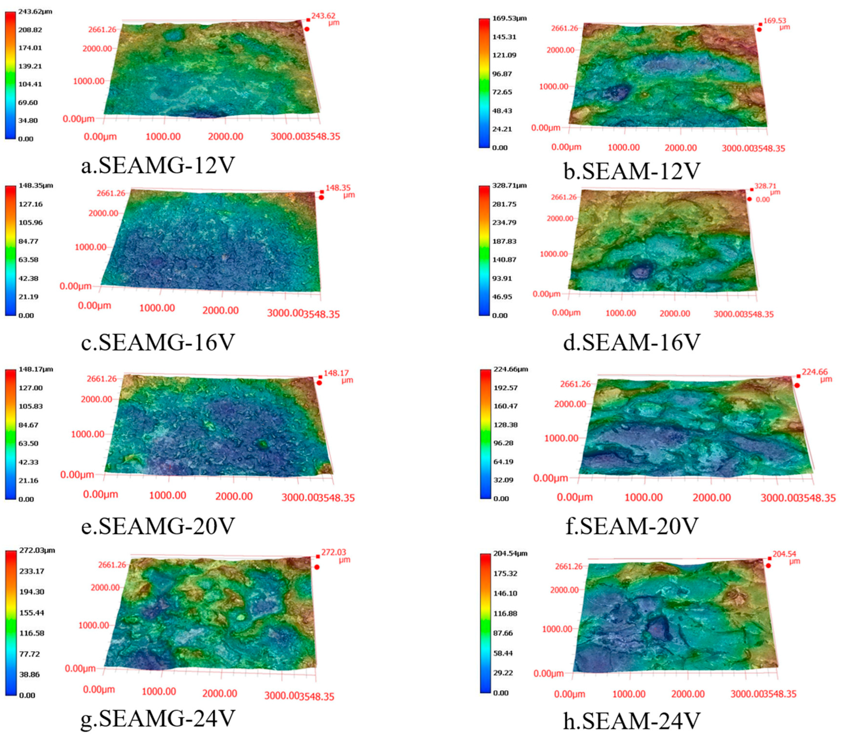 Figure 8a–d show the surface topography of samples processed by short electric arc machining grinding at discharge voltages of 12 V, 16 V, 20 V, and 24 V, respectively. For comparison,