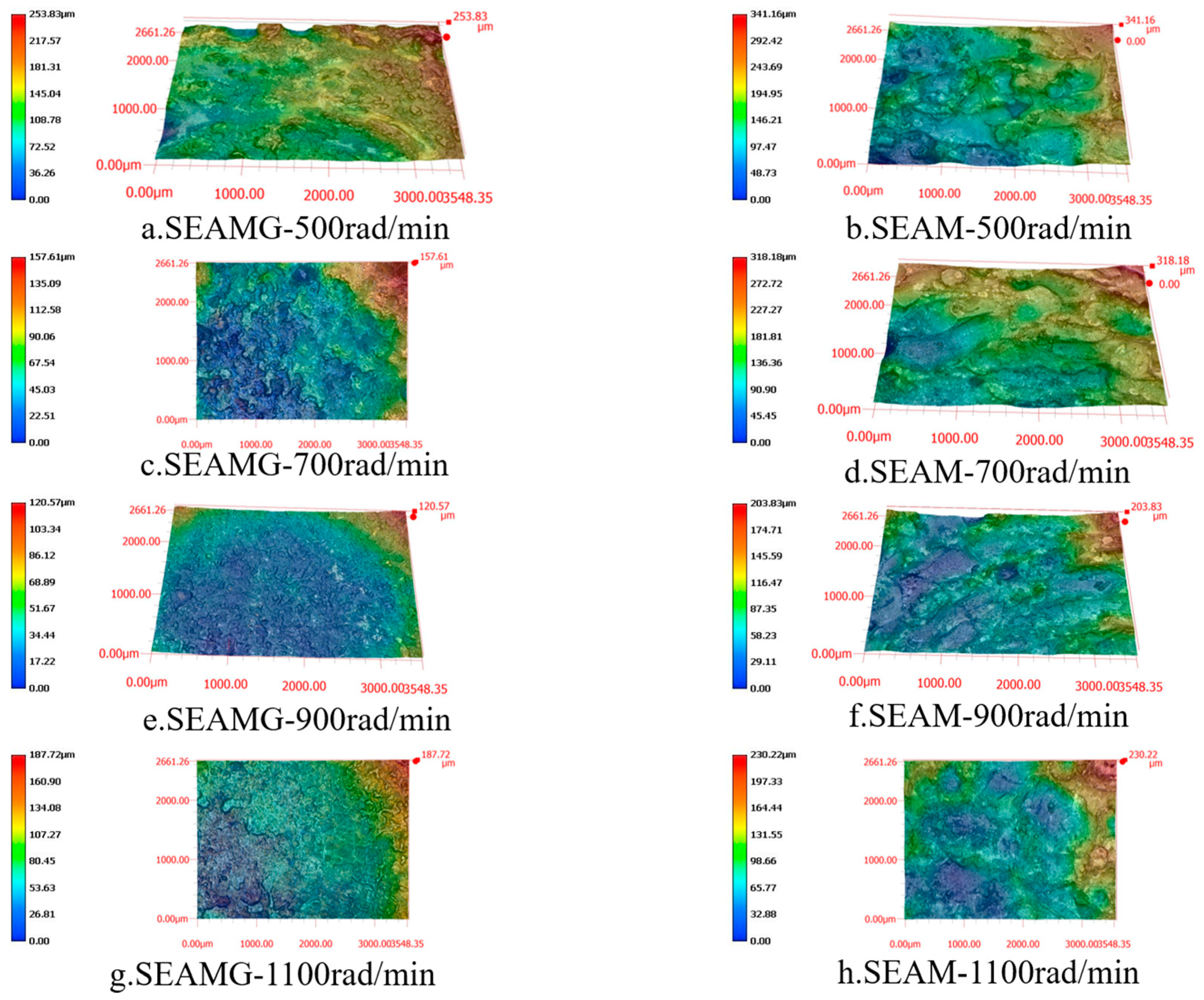Figure 9a–d illustrate the overall surface morphology of short electric arc machining grinding at different spindle speeds. Consistent with prior research, surfaces processed by low-pressure micro-arc grinding exhibited superior uniformity and consistency compared to those processed by short electric arc machining grinding (
