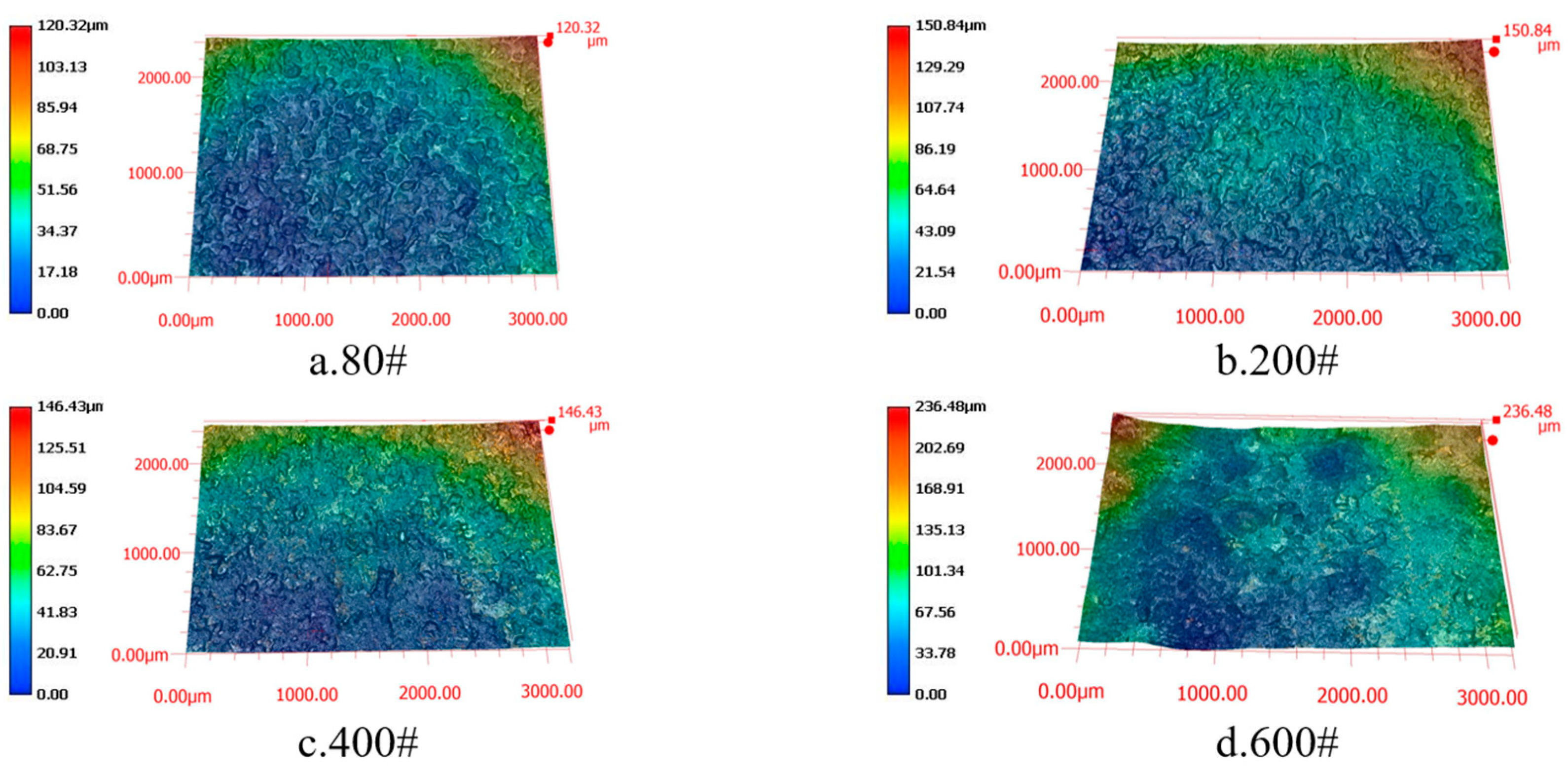 Figure 6 presents the surface morphologies obtained from short electric arc machining grinding with different diamond grit sizes (80#, 200#, 400#, 600#) as shown in images a, b, c, and d, respectively. The experimental data indicates that lower diamond abrasive particle sizes significantly reduced surface roughness. When processed using 600# abrasive grains, the surface exhibited pronounced protrusions and depressions, resulting in high and irregular roughness. As particle sizes decreased to 200# and 400#, surface roughness progressively diminished with finer, more uniform textures and markedly reduced defects. The 80# abrasive grains demonstrated optimal processing performance, featuring minimal surface height variations and significantly reduced roughness values. This demonstrates that in low-pressure micro-arc grinding processes, lower particle sizes effectively reduce grinding forces and thermal effects, thereby achieving more uniform and smooth surfaces. The findings indicate that selecting appropriate abrasive grain sizes is crucial for optimizing surface quality in low-pressure micro-arc grinding processes, where lower particle sizes significantly enhance surface finish and consistency.