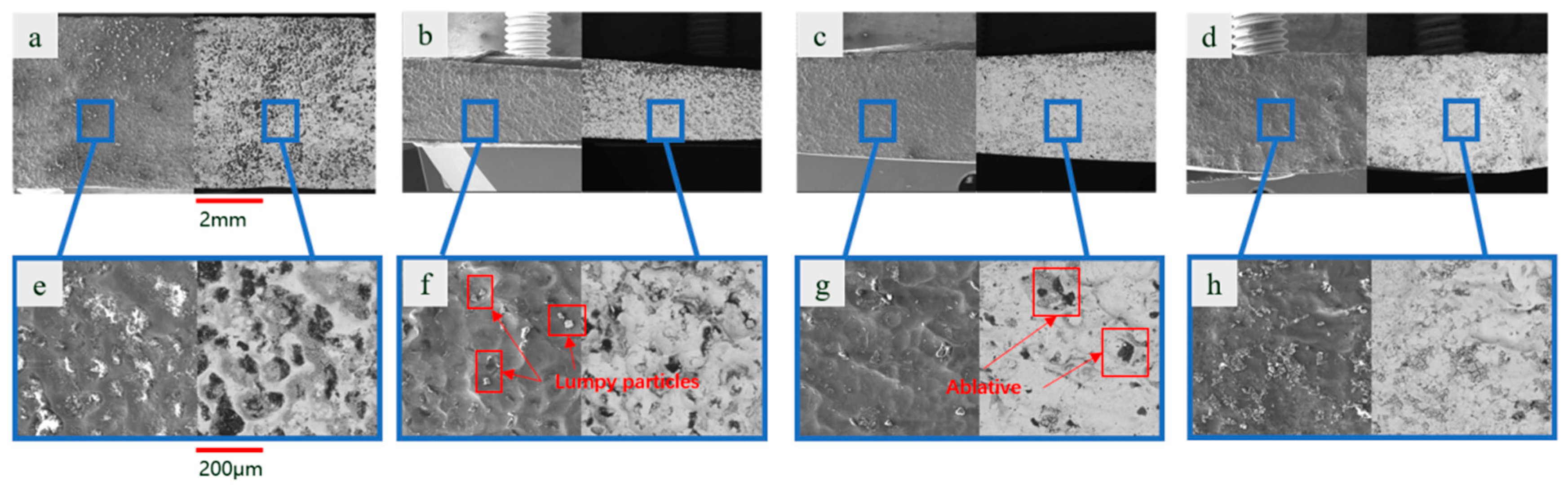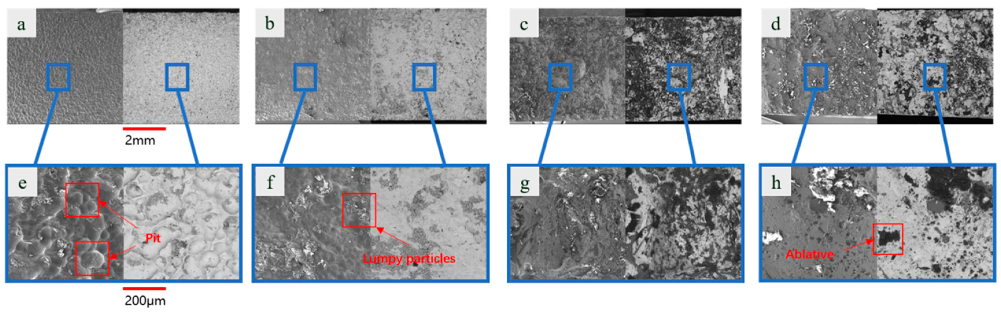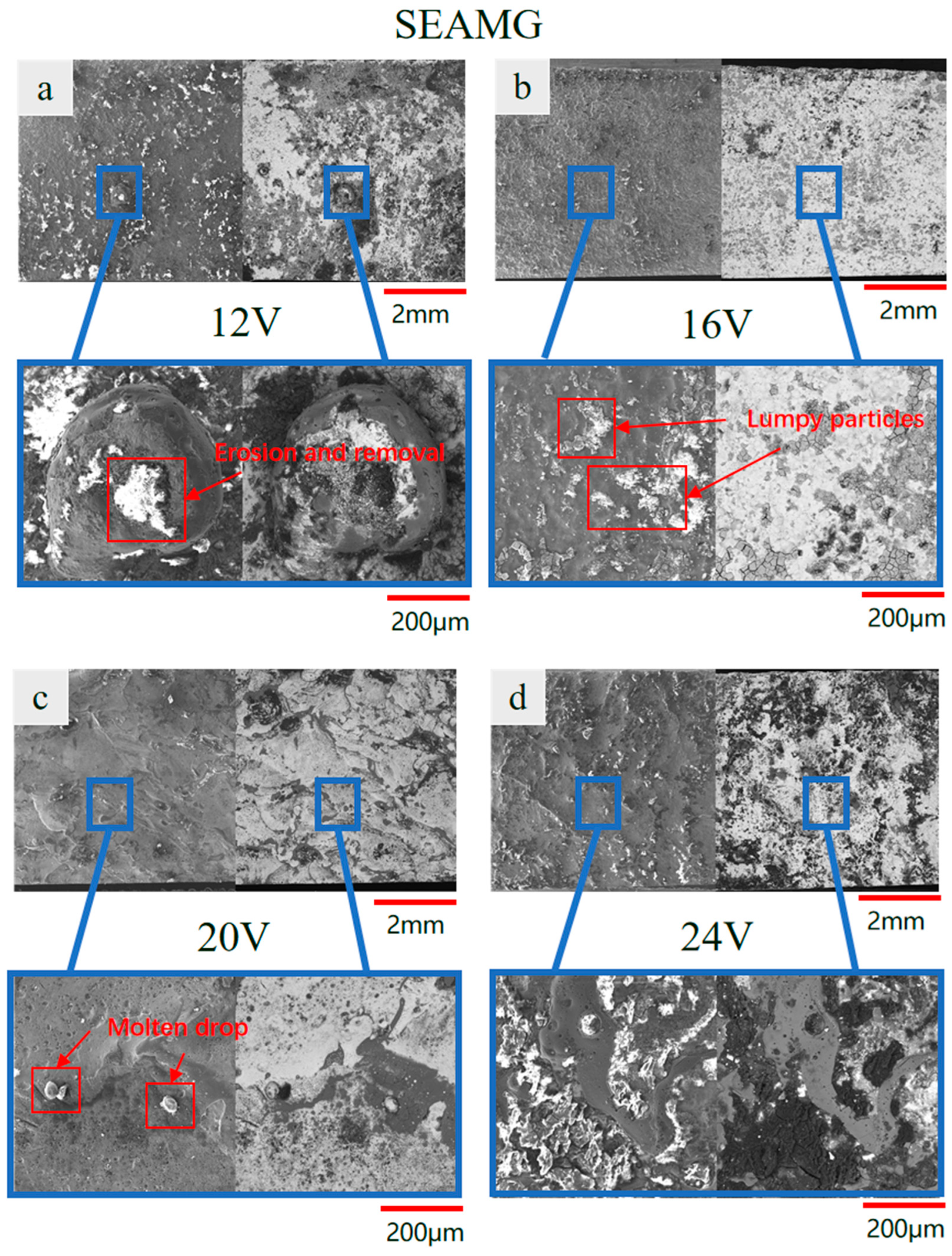 Figure 8e), uneven pitting and minor molten deposits already appeared on the surface; as voltage increased, melting, spattering, and accumulation became increasingly severe (