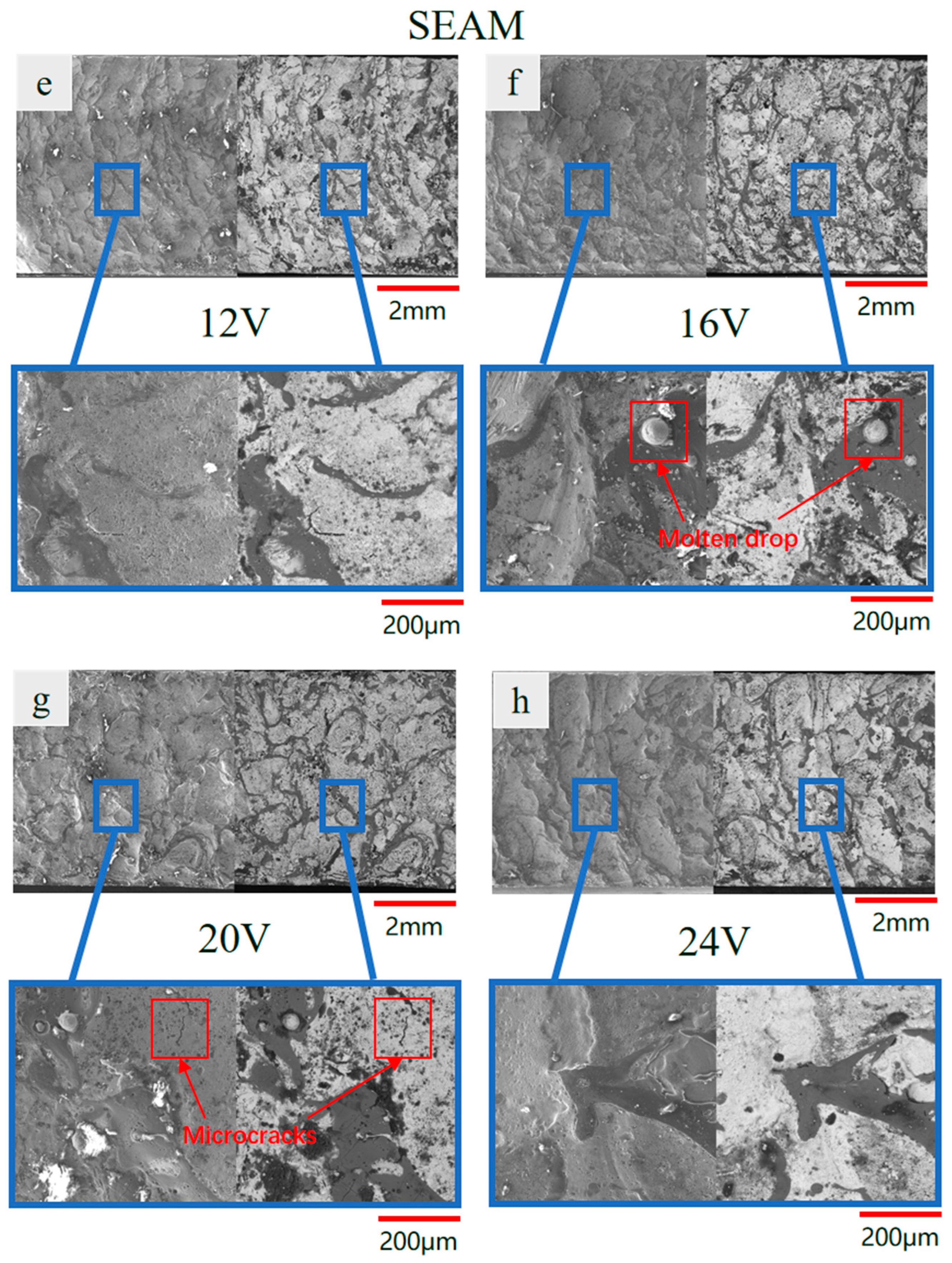 Figure 8e–h), surface quality exhibited extreme sensitivity to voltage variations. At 12 V (