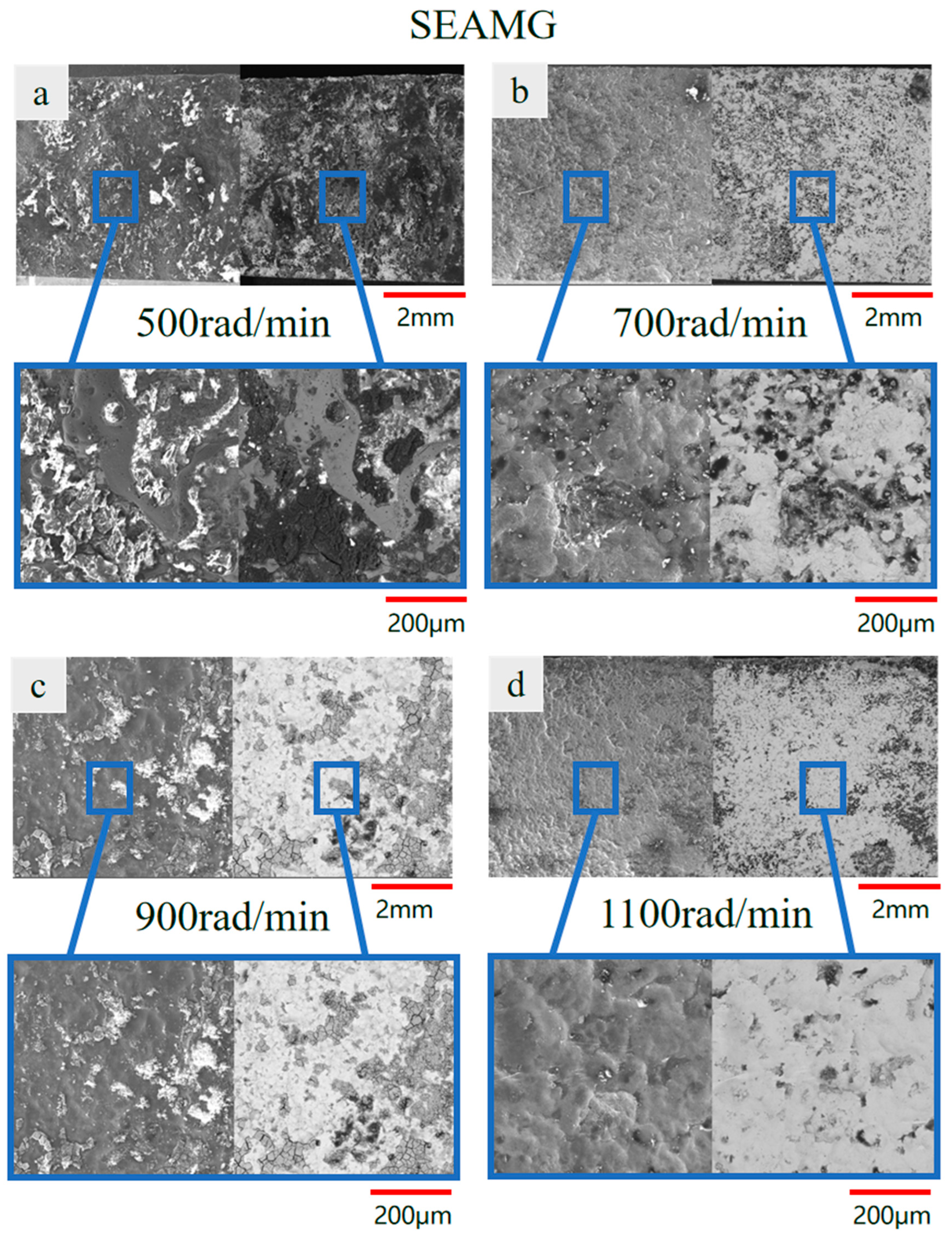 Figure 9a), a fusion of slight grinding traces and micro-arc discharge features was visible; with higher speeds (