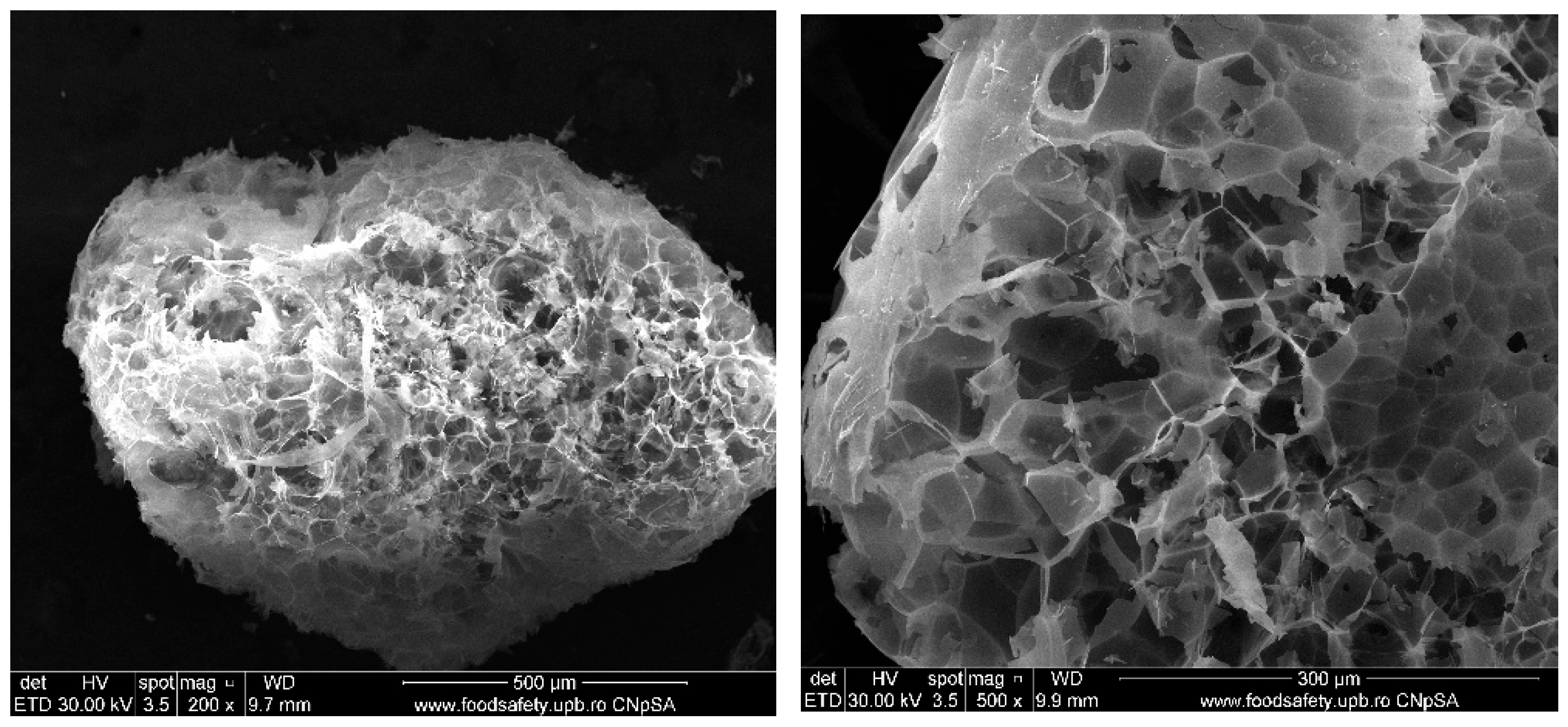 • Commercially available (Procema perlit, Jilava, Romania), expanded perlite—(EP) with particle sizes below 2 mm, density (dry in loose state) comprised between 40 and 65 kg/m3, and low thermal conductivity (max. 0.042 W·m−1·K−1)—according to the product data sheet. This material contains round particles with high porosity (Figure 2) resulting from the thermal treatment of natural perlite, due to the water release [6,18].