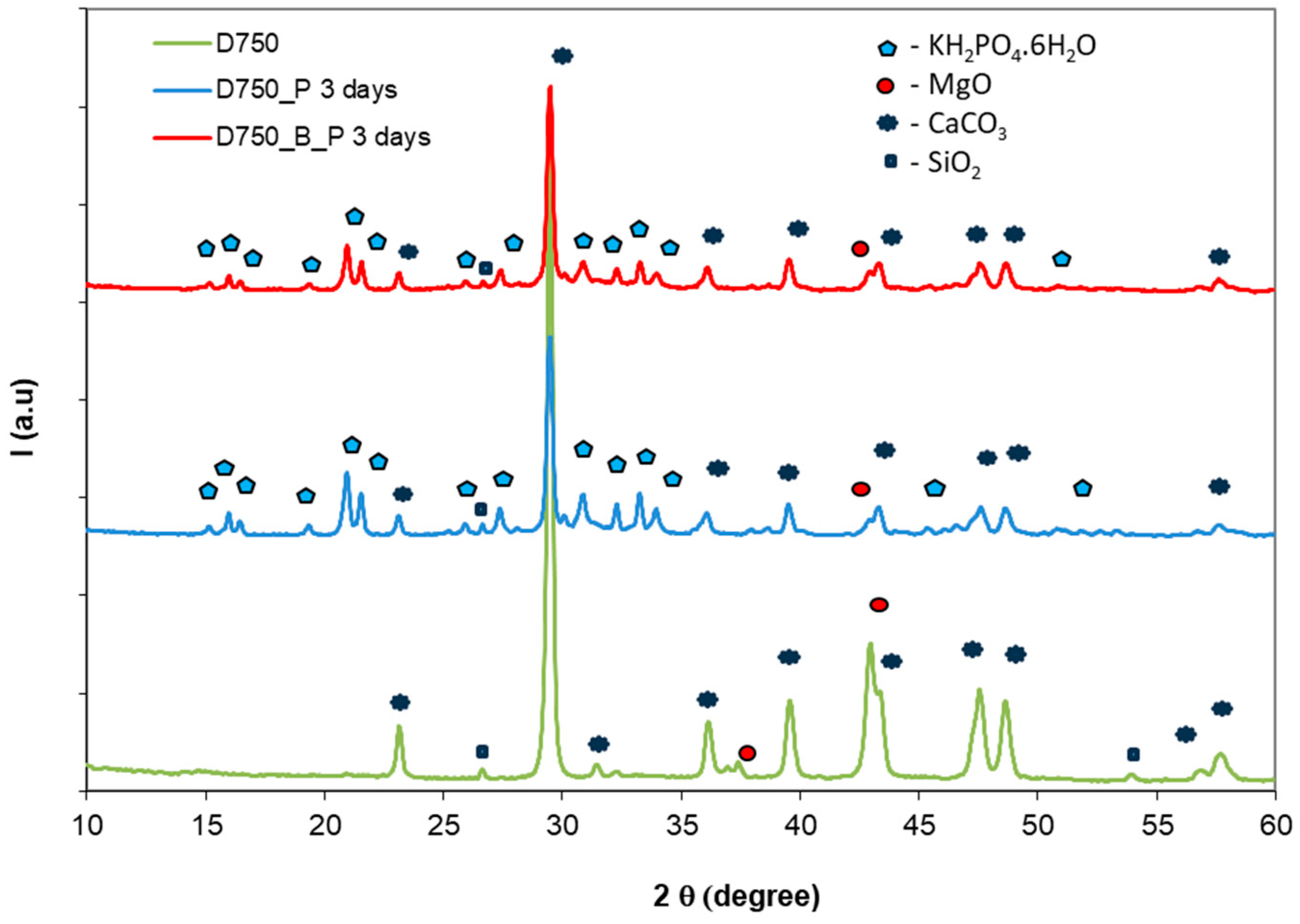 The mixing of thermally treated dolomite (D750) with the phosphate solution also leads to the formation of K-struvite. On the XRD patterns, shown in Figure 3, the peaks of K-struvite (PDF 01-090-9099) and calcium carbonate (PDF 01-086-4272) from D750 can be observed on the cement pastes hardened for 3 days.