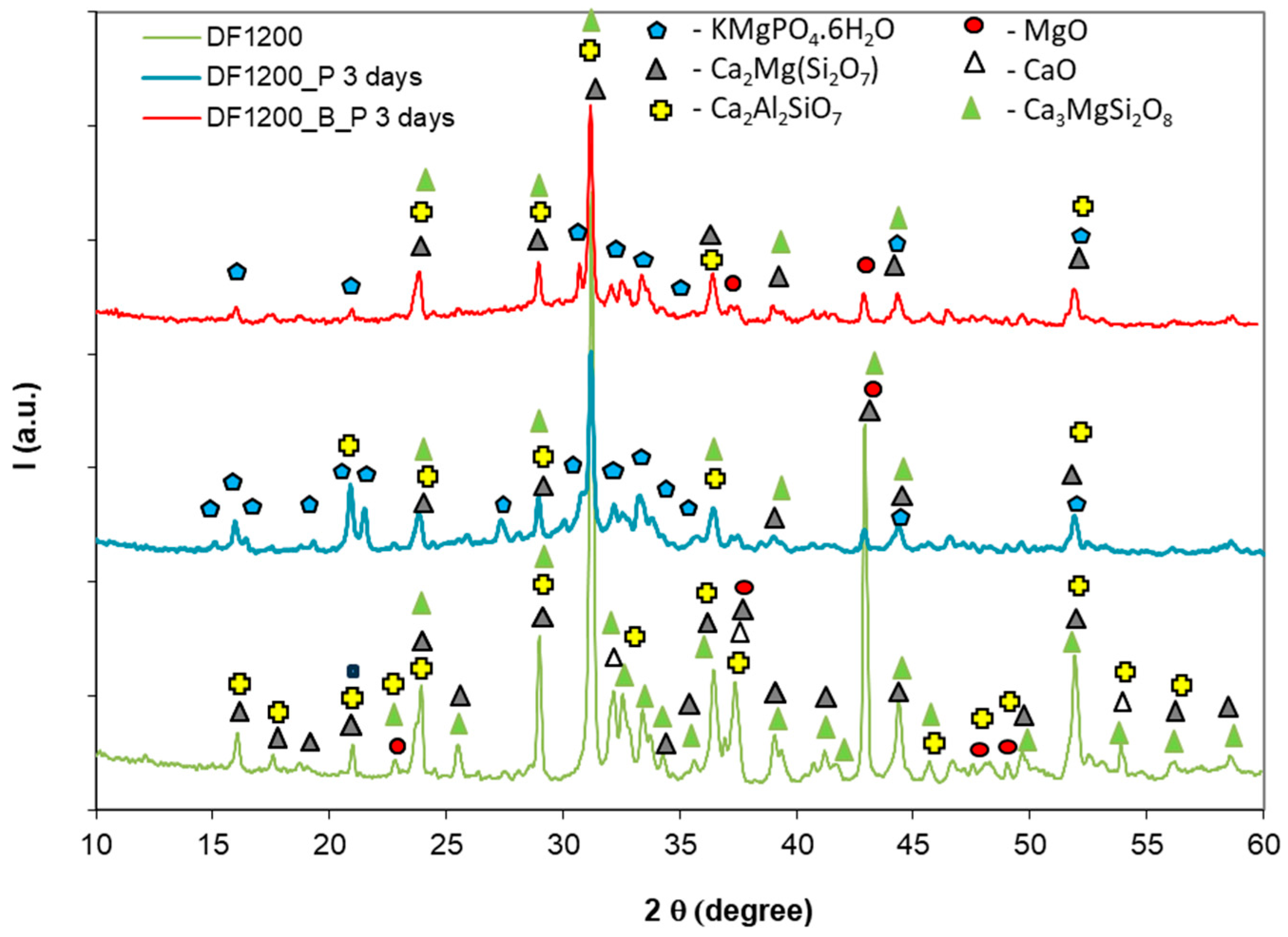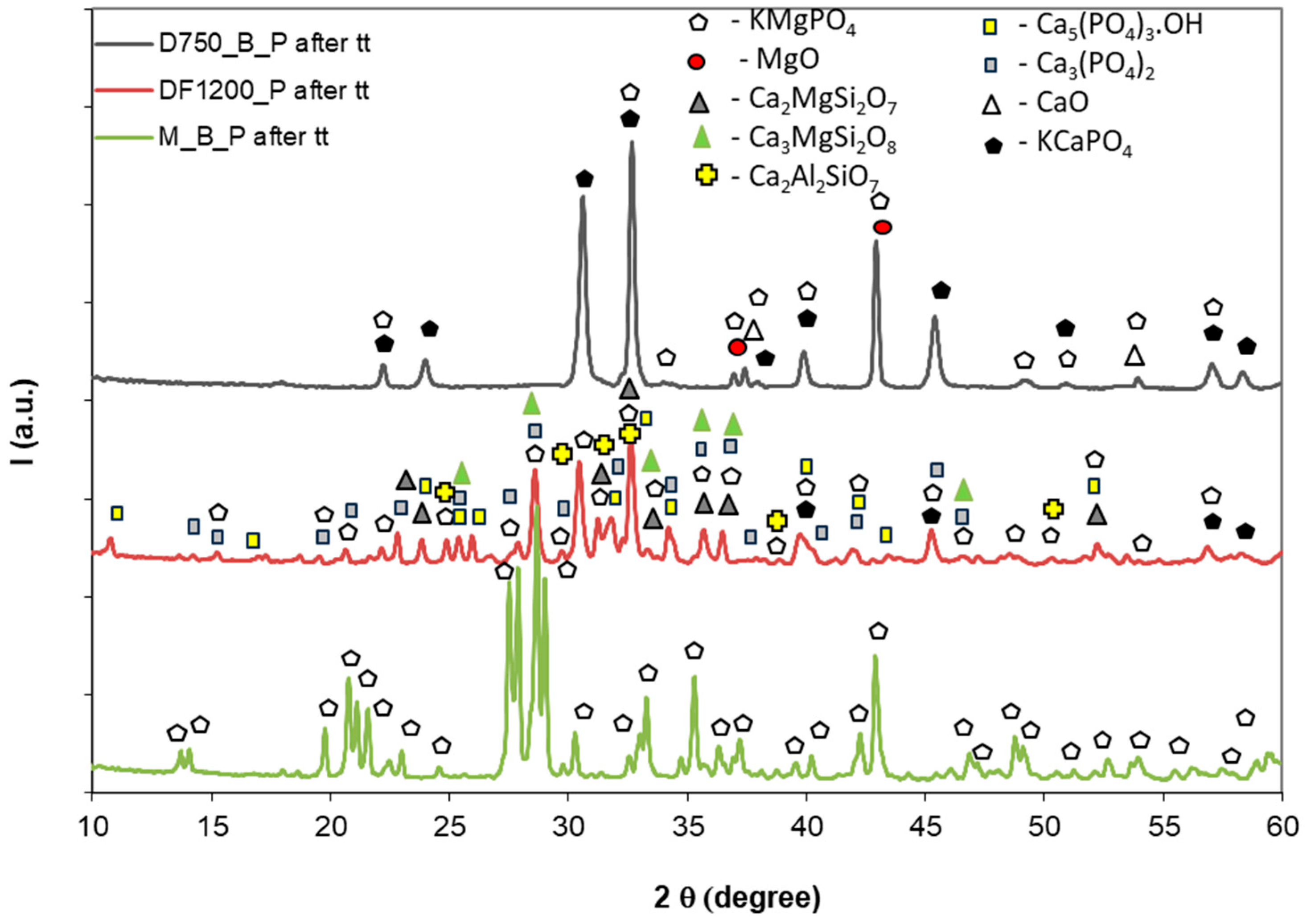 For the thermally treated M_B_P cement, one can notice the total dehydration of K-struvite with the formation of KMgPO4 (PDF 04-009-7824) [6]. For D750_B_P, the compounds identified were KMgPO4, KCaPO4 (PDF 01-091-8238), and MgO (PDF 00-004-0829). On the XRD patterns of the DF1200_P composition, after thermal treatment, one can identify the presence of gehlenite, merwinite, akermanite, KMgPO4, and KCaPO4. On the XRD pattern of this specimen, one can also notice the presence of hydroxyapatite Ca5(PO4)3OH (PDF 04-010-6312) compound, which can result from the reaction of bioactive compounds (merwinite and akermanite) with phosphate solution [24,25,26]. Initially, it exhibits a low degree of crystallinity, but its crystallinity increases with the rising temperature. Since in this study the thermal treatment was performed at 1200 °C, hydroxyapatite begins to decompose, forming Ca3(PO4)2, as also confirmed by XRD [27,28]. Due to the rapid heating and short holding time (30 min) at 1200 °C, Ca5(PO4)3OH may still be present within the interior of the tested specimens (cylinders).