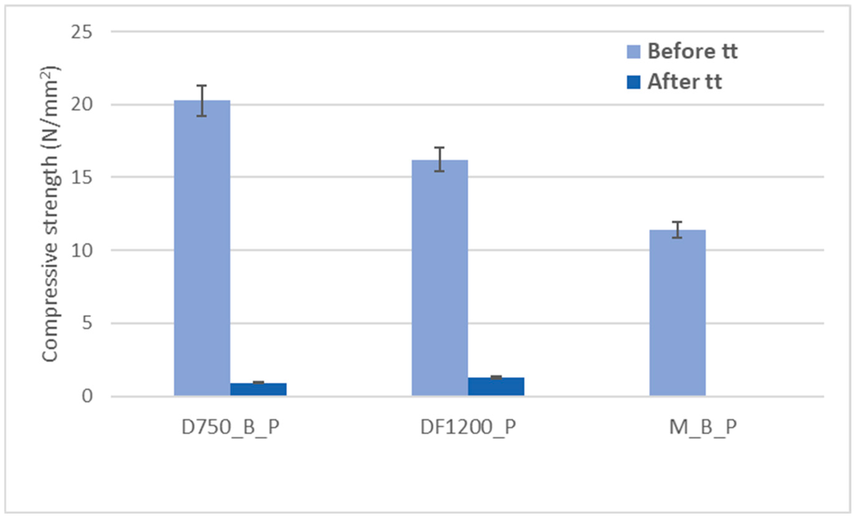 As shown in Figure 6, the thermal treatment applied to the hardened cement pastes leads to a notable reduction in compressive strength, which could be partially due to the thermal shocks suffered by these specimens due to the rapid growth in the temperature. For the D750_B_P specimen, a decrease in the compressive strength of 95% was recorded, and for the DF1200 specimen, the decrease is 92.12%. Following thermal treatment, the M_B_P specimen exhibited no measurable compressive strength. The occurrence of cracks in the surface layer of the specimen M_B_P after the thermal treatment (Table 3) suggests that material segregation appears to have occurred due to the use of a high water to solid ratio (0.3). Therefore, further experiments were conducted with a reduced water content, using water to solid ratio of 0.2.
