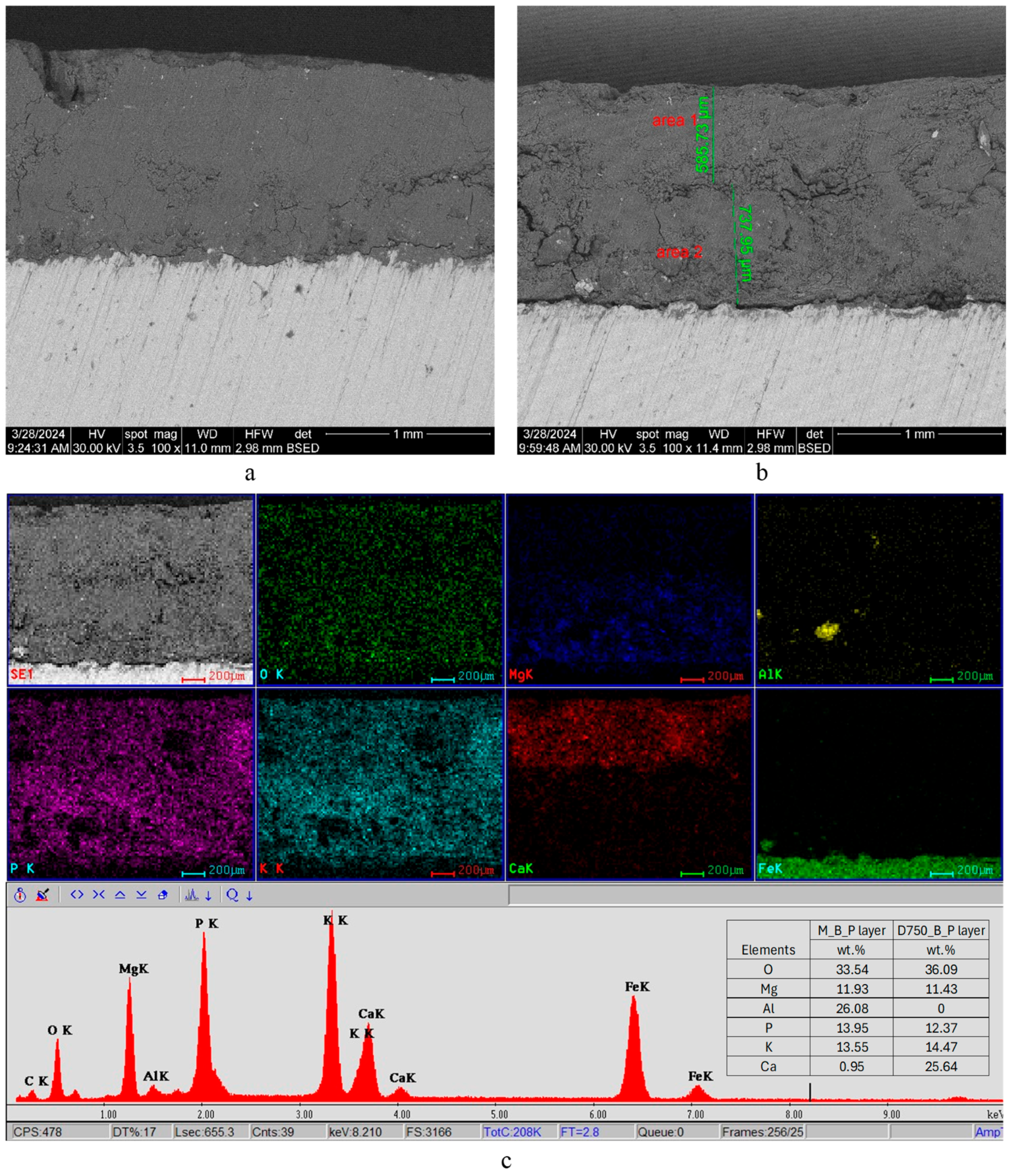 A continuous and dense interfacial transition zone, indicative of good compatibility, can be observed between the M_B_P coating and the surface of the steel plate (Figure 8a). Additionally, a dense and continuous interface is visible between the M_B_P and D750_B_P layers (Figure 8b).
