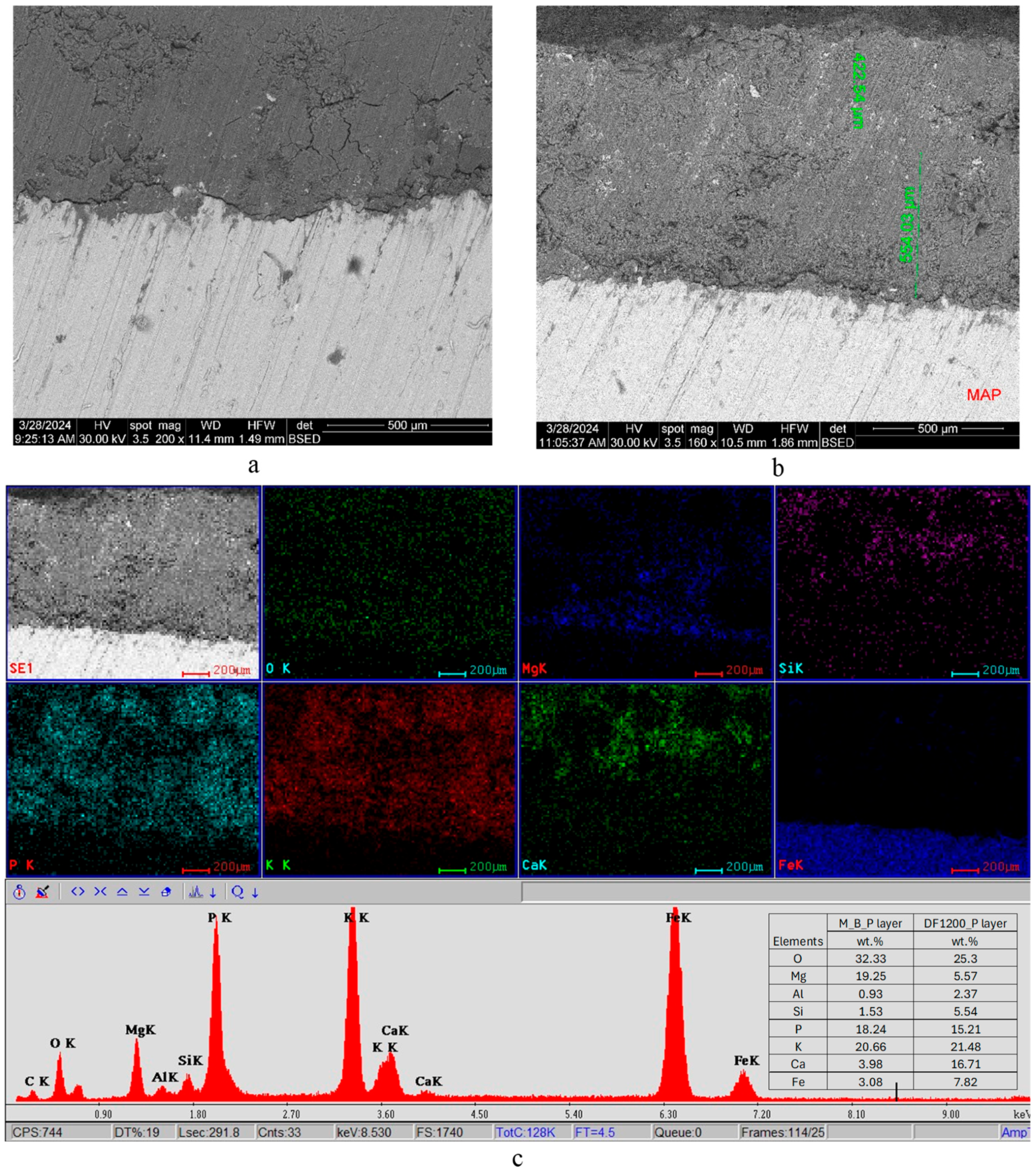Figure 9. SEM images (a,b) and EDX analysis (c) of the metallic plate coated first with a layer of M_B_P cement, followed by a layer of DF1200_P cement. Insert in (c) shows the elemental composition assessed by EDX on micro areas of the M_B_P layer and DF1200_B_P layer.