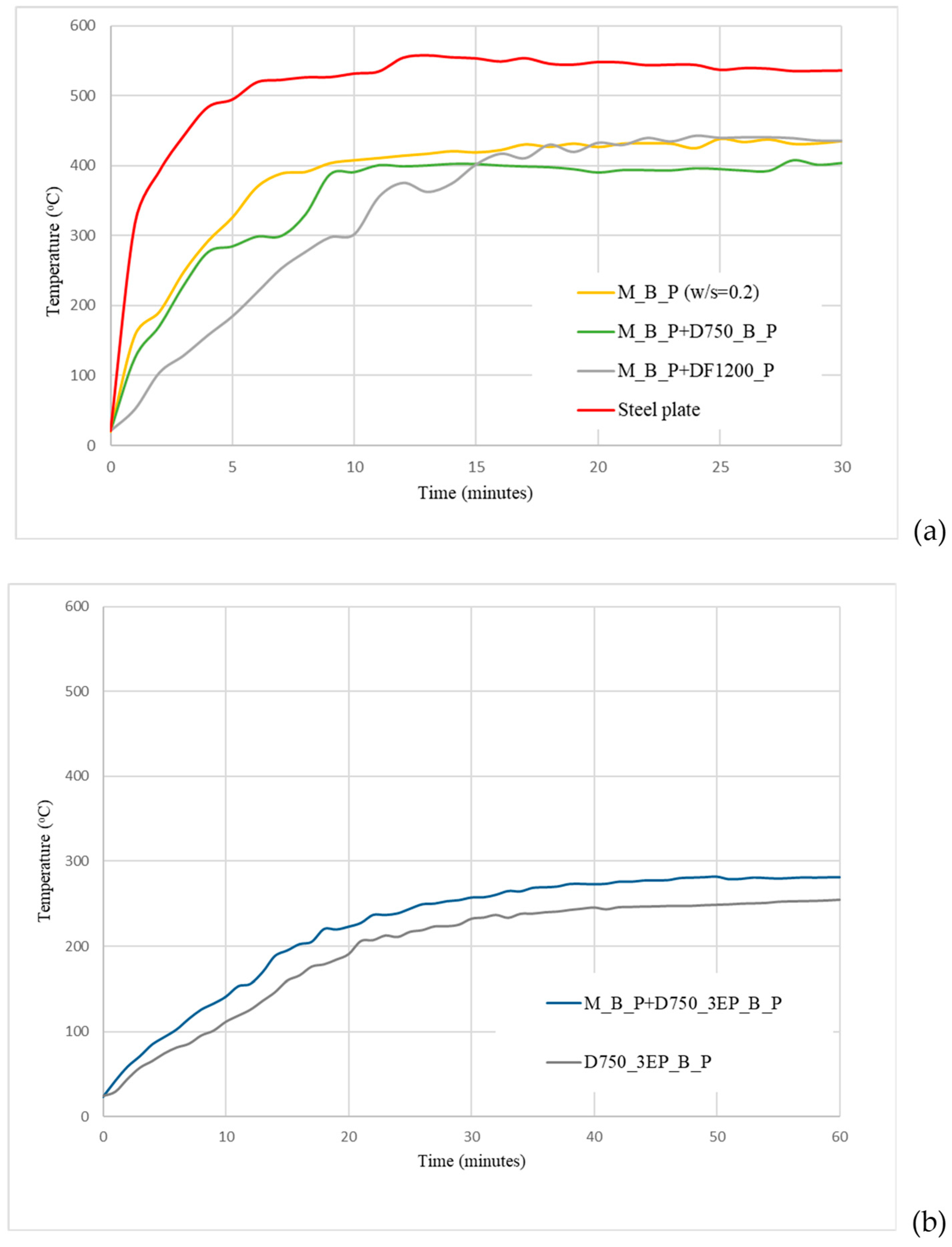 The temperature of the steel plate was recorded at 1-min intervals over 30 or 60 min on the opposite side of the cement coating, using an infrared thermometer with an accuracy of ±1% relative to the recorded temperature displayed on the digital screen of the device. An uncoated steel plate was used as a reference.