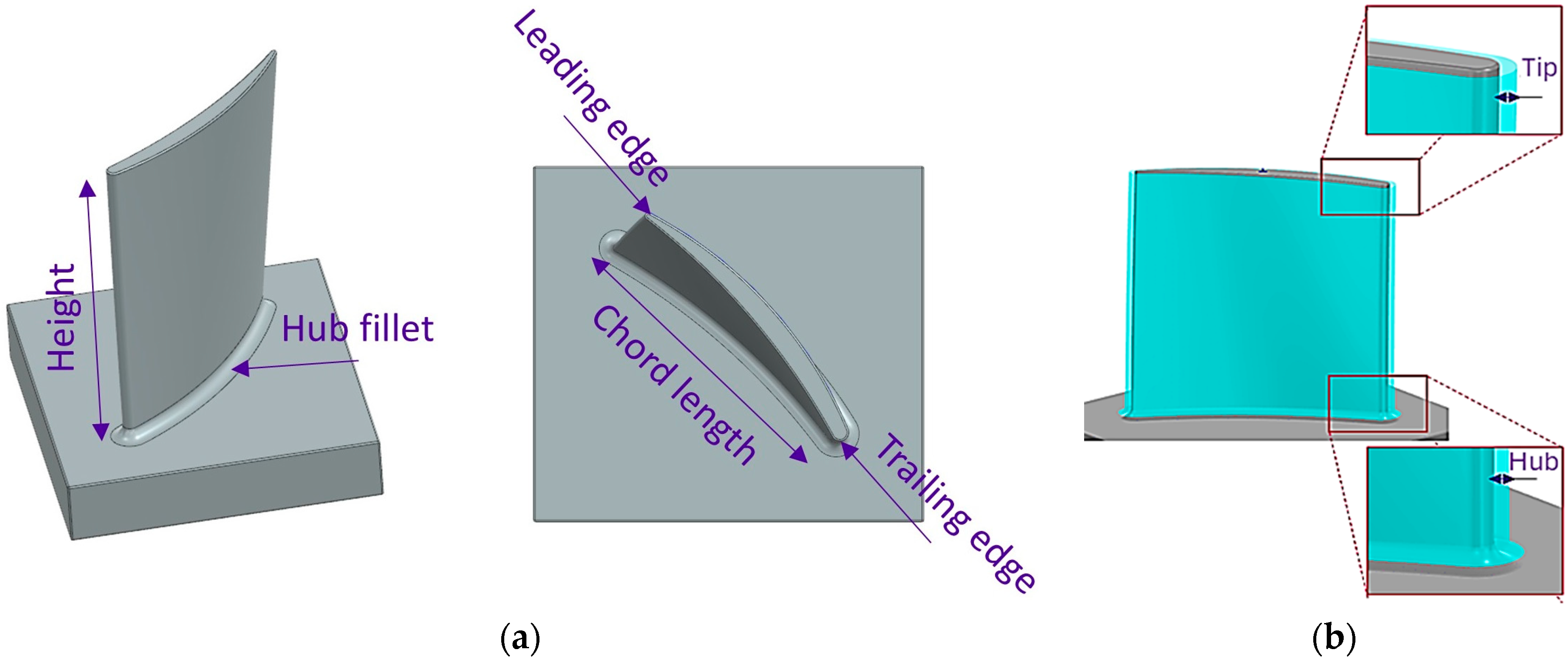 To establish a representative geometry for the research demonstrator, a survey of various commercial and military jet engines was conducted. As compressor blades are typically machined either as individual components or as integral features of a blisk, the compressor module was selected as the reference architecture [23,24]. To standardise the design across engines with differing numbers of stages, the 5th stage was identified as an appropriate average reference point. Accordingly, a 5th-stage compressor blade was defined as the finished demonstrator geometry. The blade has a span of 50.15 mm, a chord length of 42.16 mm, a hub fillet radius of 2 mm, a leading-edge (LE) thickness of 1.25 mm, and a trailing-edge (TE) thickness of 0.5 mm, reflecting typical proportions observed across the surveyed engine designs as shown in Figure 1a. The surface quality of the designed blade was assessed using reflection analysis, in which 256 black and white stripes were projected onto the surface from multiple angles. Distortions in the reflected patterns were used to identify surface irregularities.