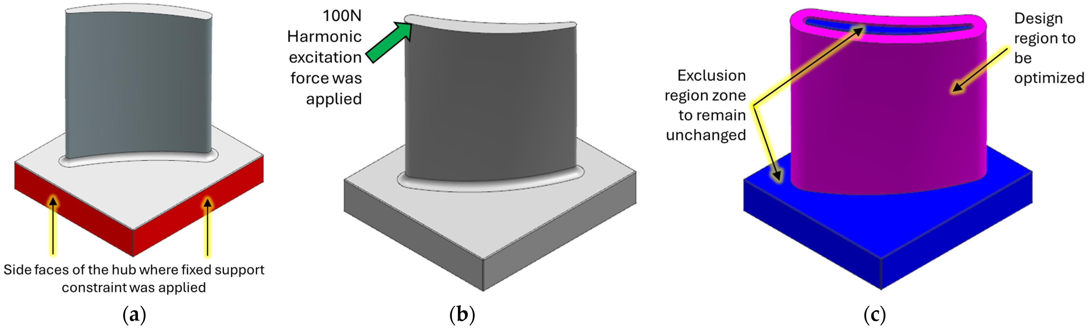 Figure 2. Finite element analyses and topology optimisation descriptions for the blade: (a) fixed constraint around the hub; (b) harmonic excitation; (c) design and exclusion regions.