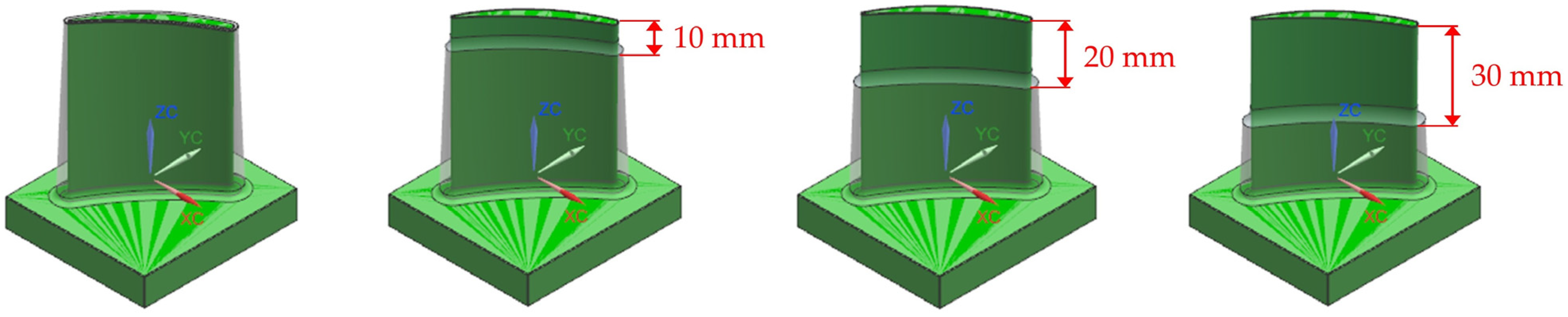 The study aimed to determine the changes in the designed blades and the subsequent topology-optimised configuration not only in their state prior to machining but also in their in-process state. To this end, the method followed by Kienast et al. (2024) [21] was adopted, and in-process geometries were created for each blade in increments of 10 mm up to a depth of 30 mm, which is more than half the blade height. The aforementioned harmonic response simulations were also applied to these geometries. Figure 3 shows the in-process workpieces with cutting location depths of 10 mm, 20 mm, and 30 mm for the exemplary V6 (3-1 mm variable stock) blade configuration.