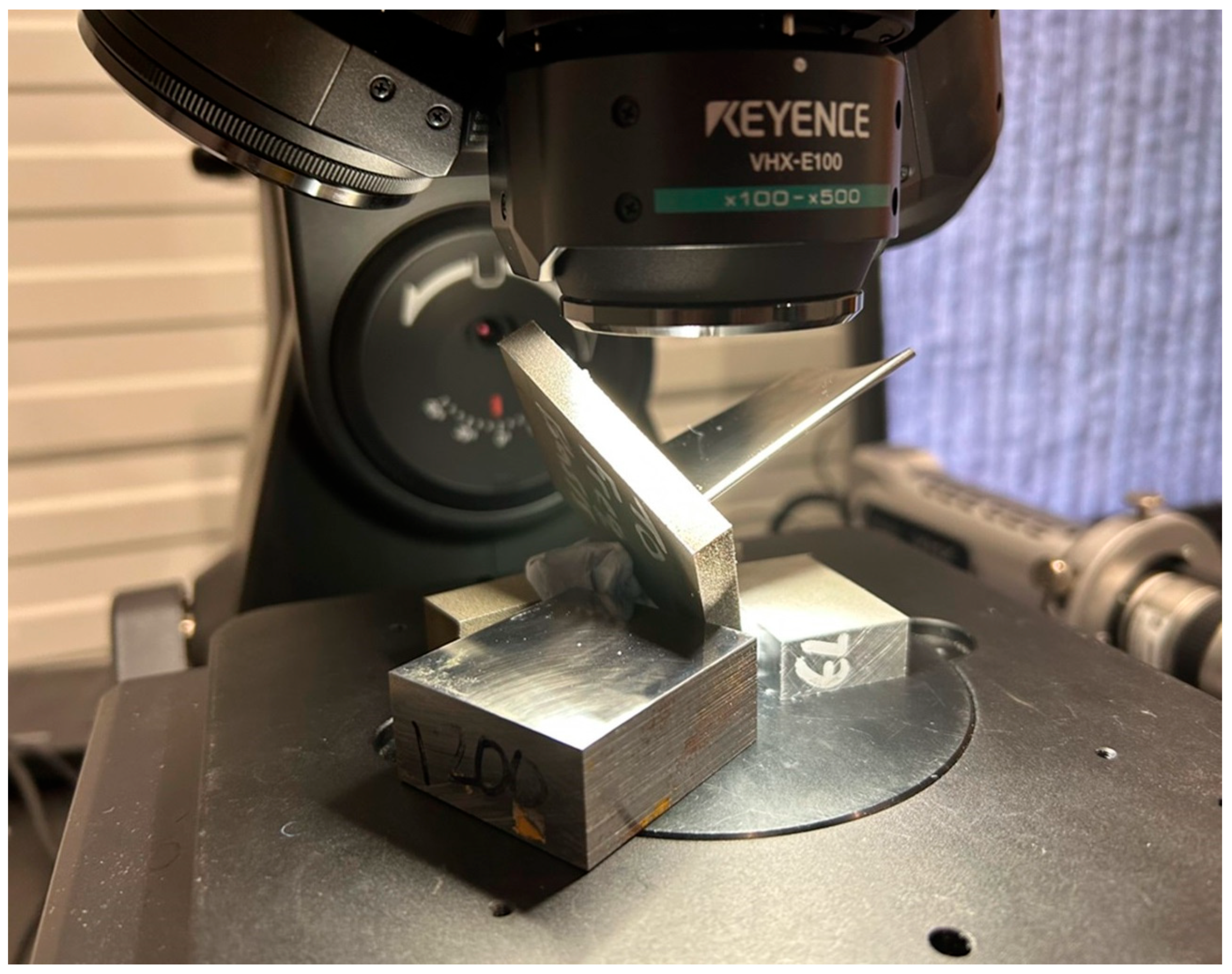 To measure surface quality, as demonstrated in Figure 5, each blade was tilted according to the specific measurement region, such as the hub, tip, leading edge, or trailing edge, to ensure accurate alignment and data capture. Five measurement regions were acquired from each blade face to provide a representative surface profile. Surface quality characterisation was performed using a Keyence VHX-E100 digital microscope (Osaka, Japan) with full-ring illumination to ensure uniform lighting and minimise shadowing effects. Measurements were taken 3 times and at 100× magnification, with each region having a measurement area size of 3 mm × 2.5 mm. The reason for utilising reduced area sizes was to minimize the influence of the freeform surface on the overall surface quality results. The data were subsequently processed using VHX software in 3D depth mode. A whole-plane tilt correction was applied to ensure consistency across angled surfaces and to enable visual interpretation of the surfaces alongside the numerical values obtained. Arithmetical mean height (Sa) of the surfaces was reported without filtering. The fundamental reason for omitting filtering was that tilt correction and planarisation had already been performed for visual examination, and further filtering could potentially reduce the apparent influence of chatter or tool marks.