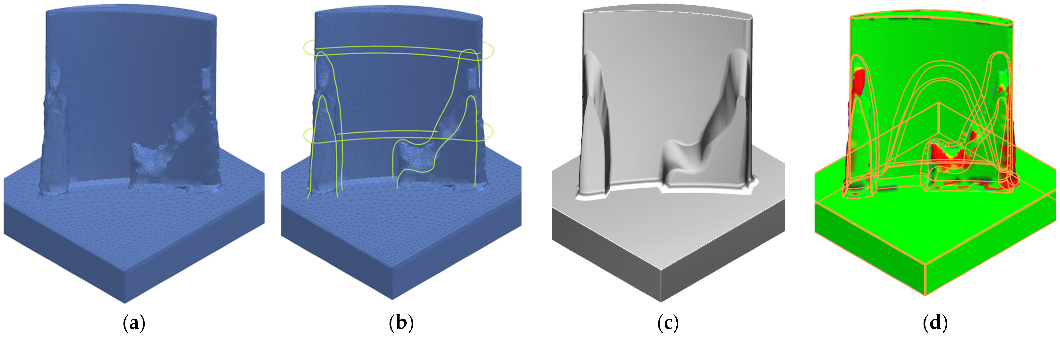 Figure 7. (a) Mesh geometry imported into Siemens NX; (b) spline curves used in surface reconstruction; (c) reconstructed body; (d) deviations between mesh and reconstructed surface.