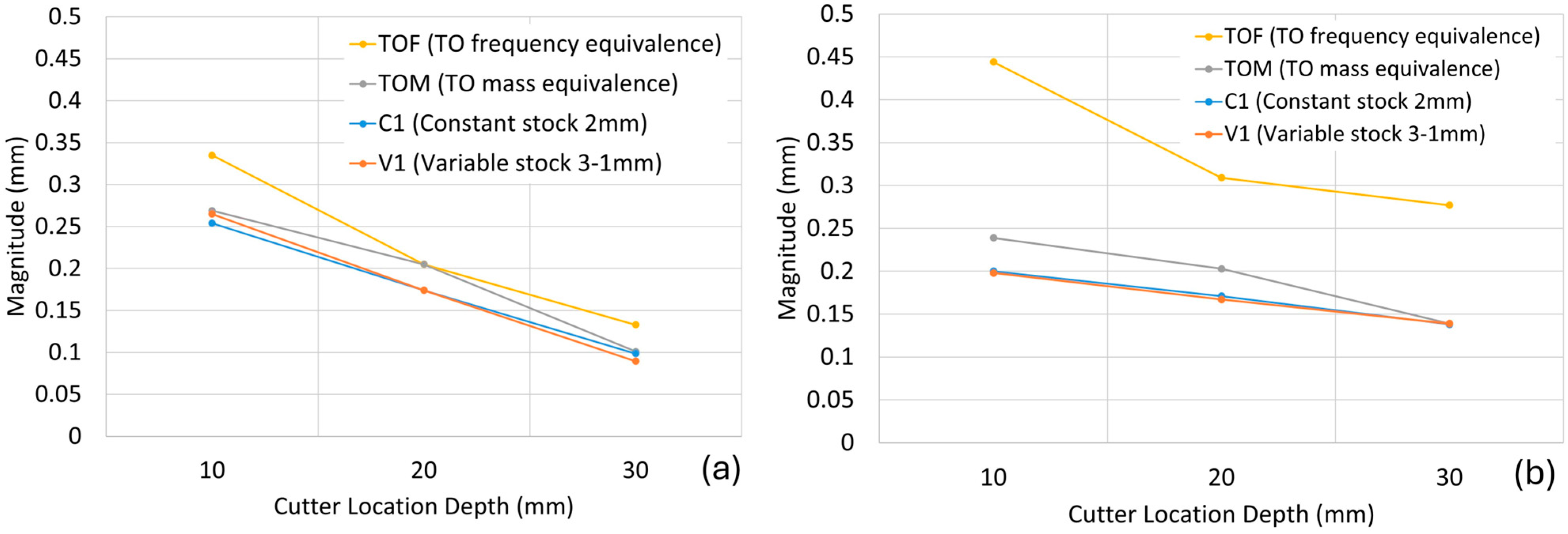 The harmonic analyses for the in-process geometries, which were created with 10 mm cutting depths as specified in the Materials and Methods section, were performed for two selected frequency values and for the fixed, variable, and topology-optimised blades. The obtained results are presented in Figure 8. As can be seen from the figure, regardless of the blade configuration and stock value, a lowering of the cutting depth level—moving away from the tip and closer to the hub—causes the magnitude values to decrease at both frequencies. This behaviour is more linear-like and closer to each other for the blade configurations with fixed (C3) and variable stocks (V6), whereas it is more irregular in the topology-optimised blades (TOF, TOM). This situation can be interpreted by the significant change in the geometric characteristics of the topology-optimised blades as they are machined. Another interesting deduction is related to the blade optimised for equal frequency. This blade lost the similar frequency and magnitude values it exhibited before machining during the first machining operation and showed increased magnitude values compared to the reference blade.
