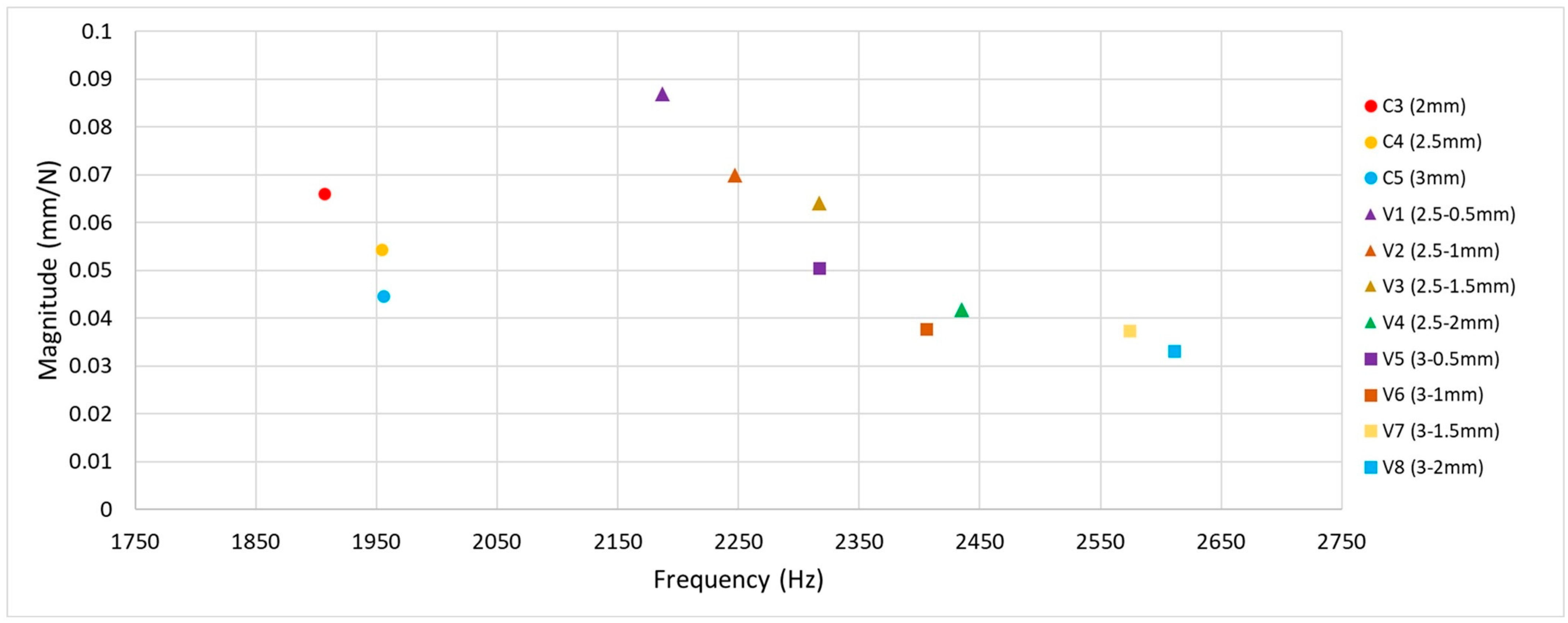 Following tap testing with the Productive Machines Impact Hammer kit and initial data visualisation in DigiTap software, the collected data were exported in CSV format for further refinement and analysis. As noted in the finite element analysis section, preliminary simulations had identified significant issues with the 0.5 mm constant stock configuration, which exhibited excessive vibration magnitudes. Accordingly, this configuration was excluded from further study based solely on virtual investigations.