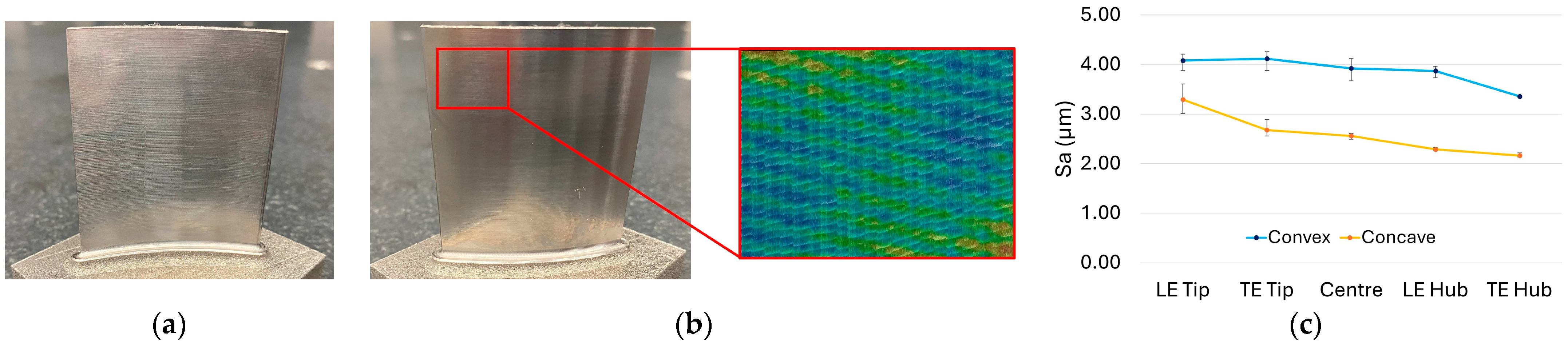 Figure 13. Surface condition of C3 (2 mm constant stock) blade configuration: (a) concave face; (b) convex face with surface texture mapping; (c) Sa (µm) surface roughness plot according to different regions of the blade.