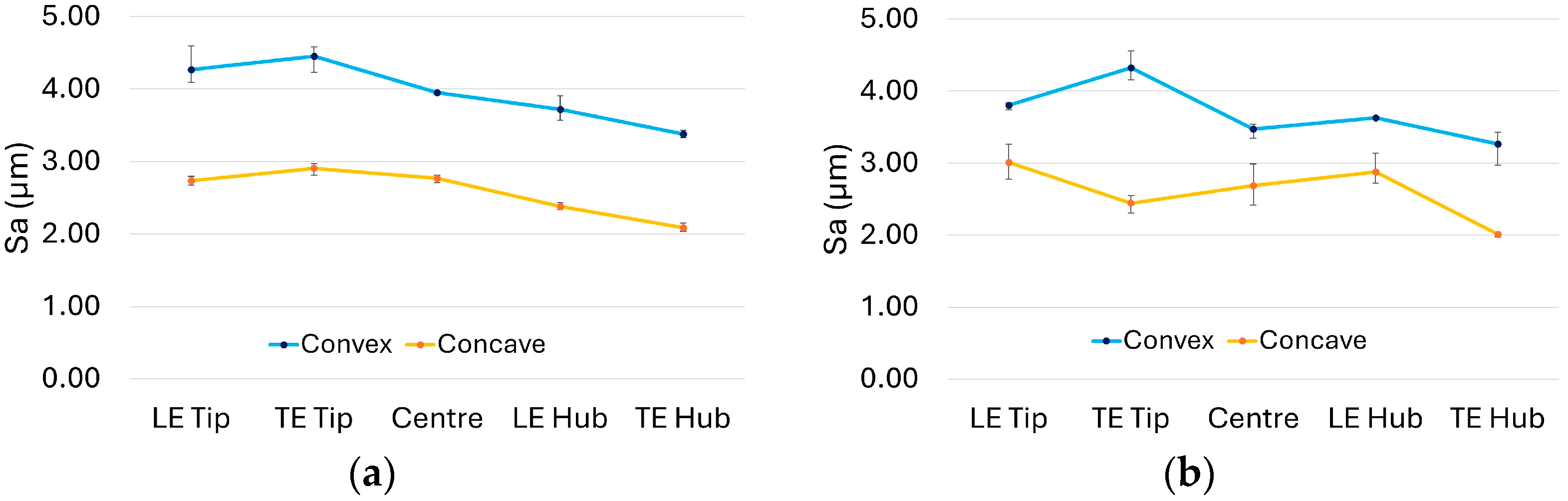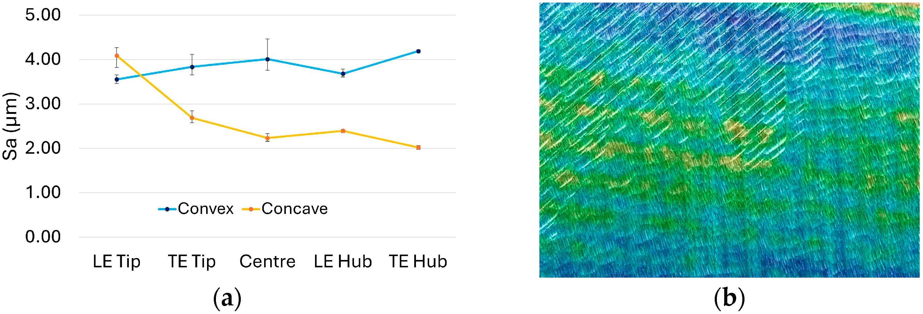 As evident from the images, the variable stock blade exhibits a similarly uniform surface texture to the constant stock blade. In contrast, surface irregularities on both optimised blades are visually pronounced and discernible to the naked eye. These observations are further supported by the Sa (µm) surface roughness plots in Figure 14. While the variable blade (Figure 14a) does not show a distinct trend of increasing or decreasing roughness across different regions, its surface texture remains comparatively uniform relative to the optimised configurations. Both optimised blades, however, display pronounced fluctuations in surface roughness along the span from hub to tip (Figure 14b and Figure 15a). These irregularities are likely associated with uneven material removal, variations in radial depth of cut, and the resulting process instabilities.