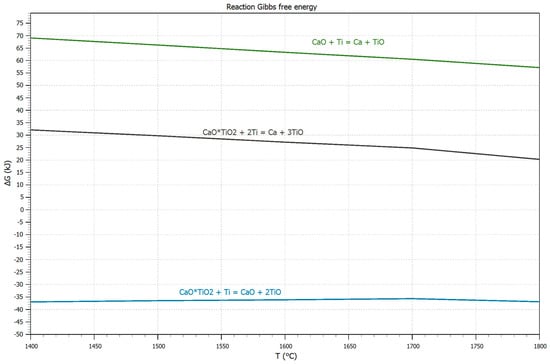 The changes in Gibbs energy for reactions (1)–(3) were calculated to assess the possibility of interaction of titanium with calcium titanate. The “OUTOKUMPU HSC CHEMISTRY 8.0” was used for thermodynamic calculations. The results are presented in Figure 1.