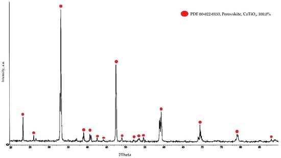 In the first step, a suspension was obtained by mixing CaCO3 (99.9%) < 20 μm and titanium oxide TiO2 (99.5%) < 10 μm powders in water at a S:L ratio of 1/2 for a long time. The suspension was dried in a drying oven and then melted in a two-electrode arc furnace. The resulting sintered materials were crushed and re-melted to achieve a homogeneous composition. After double melting, the material was crushed again to obtain powders that were sized according to particle size. To determine the effect of substrate porosity on the reaction with the titanium alloy, powders with particle size distributions of ≤0.1 mm, 0.1 mm, 0.2 mm, 0.3 mm, and 0.5 mm were used. The resulting powders were mixed with an aqueous solution of distillery sulfide stillage added at the rate of 1% by weight. Tablets of ∅40 mm and a height of 5 mm were obtained from the mixture with a hydraulic press at a pressure of 2 MPa. These tablets were sintered at 1600 °C for 2 h in a normal atmosphere in a RHTV 120–600/C 40 “Nabertherm” tube furnace. The phase composition of the obtained ceramic tablets was studied using the D8 Advance X-ray diffractometer (BRUKER, Karlsruhe, Germany) with α-Cu radiation (λ~1.54 A). X-ray diffraction was performed with focusing using the Bragg–Brentano method. Diffractograms were recorded in the range of angles 2θ: 4–90° with a step of 0.05°, the shooting speed was 2 deg/min at a voltage of 40 kV and a current of 40 mA. The description and interpretation of the obtained results were carried out using the database of the Joint Committee for Powder Diffraction Standards—International Center for Diffraction Data (ICDD). The results obtained (Figure 2) confirm that the substrates are formed by CaTiO3 monophase.