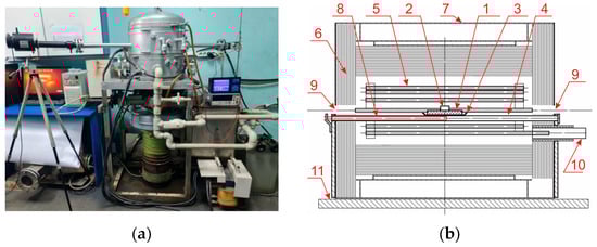 Unit intended to determine the wetting contact angle under high vacuum conditions: (a) Photo of the unit; (b) Furnace diagram. 1—ceramic substrate ∅40 mm; 2—titanium cylinder ∅10 × 4 mm; 3—molybdenum boat; 4—tungsten supports; 5—molybdenum heating elements; 6—screens made of molybdenum and heat-resistant steel; 7—outer casing of the furnace; 8—tungsten-rhenium thermocouple; 9—observation windows; 10—current leads; 11—adjustable table.