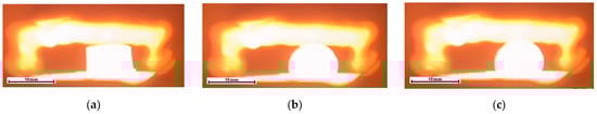 The sample on a molybdenum pallet was then placed in the unit furnace to determine the wetting contact angle (Figure 3b). When a residual pressure of 1–2 × 10−4 mmHg was reached in the unit chamber the furnace was heated. A video recording was turned on at the beginning of titanium melting while the melt temperature was continuously recorded. When the specified temperature was reached, isothermal holding was conducted. At the end of the holding, the heating of the furnace was stopped, and the sample was cooled under conditions of continuous pumping to 50–100 °C.