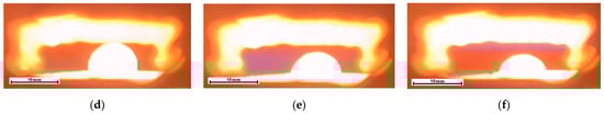 Changes in the shape of a droplet’s surface on a CaTiO3 substrate (from 0 to 0.2 mm powder) under continuous temperature increase in a furnace at a rate of 0.33 ± 0.05 °C/s. (a)—1610 °C; (b)—1668 °C; (c)—1678 °C; (d)—1708 °C; (e)—1718 °C; (f)—1728 °C.