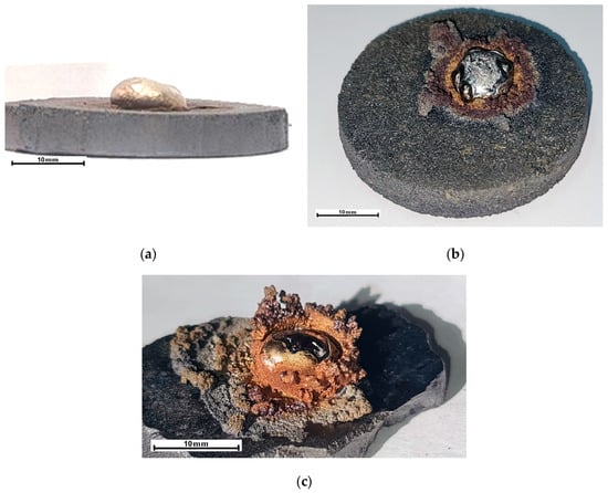 Of particular scientific interest is the release of a substance in a solid–liquid state from under a drop. This substance formed growths around the droplet’s perimeter with a loose, heterogeneous structure, partly reminiscent of dendritic crystals (Figure 6). This rim around the melt droplet formed upon heating above 1700 °C and, in some cases, prevented observation of the contact angle, leading to the termination of the experiment. The intensity of this phenomenon increased with increasing particle size of the CaTiO3 powders used to obtain the substrate. Thus, in the case of a substrate made of powders smaller than 0.1 mm, a rim barely protruding above the surface formed around the droplet (Figure 6a). For substrates made of powders of 0.1–0.2 mm, 0.2–0.3 mm, and 0.3–0.5 mm, the intensity of rim formation increased (Figure 6b). This phenomenon was most significantly observed when a substrate made of fused CaTiO3 was used (Figure 6c).
