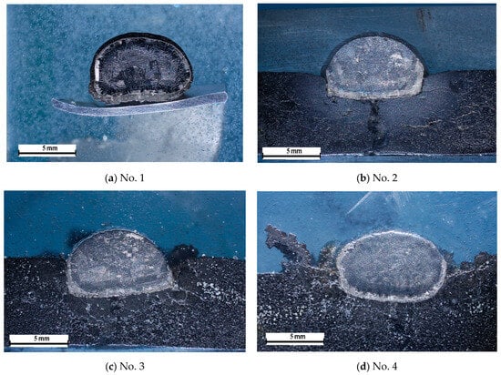 Figure 7 shows macrographs of cross-sections of the obtained samples. Analysis of these images indicates that, during interaction with the substrate, the titanium melt droplet sinks below the substrate level. Sample #6, which used a cast substrate, is least susceptible to this phenomenon.