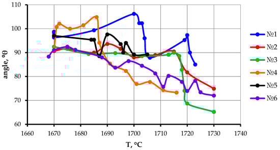 Temperature dependence of the contact angle of wetting of titanium melt on CaTiO3 substrates with different characteristics. No. 1—0.063 mm green substrate, No. 2—0.1 mm, No. 3—0.2 mm, No. 4—0.3 mm, No. 5—0.5 mm, No. 6—0.063 mm sintered.
