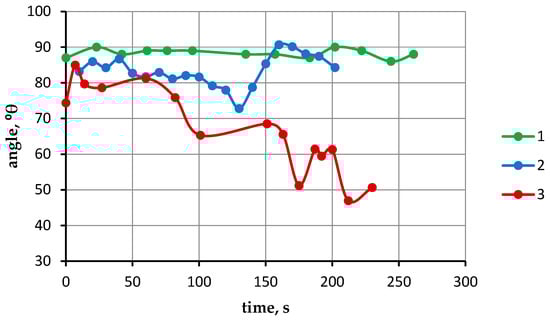 Since a study of the temperature dependence of the contact angle of CaTiO3 substrates revealed that at temperatures close to the melting point of titanium, the contact angle is close to 90° and even exceeds this value, this indicates that wetting does not develop. However, since the studies were conducted under conditions where the temperature gradually increased, the contact angle cannot be considered steady-state. To assess the change in the contact angle over time, tests were conducted under conditions close to isothermal. Sintered substrates of 0.063 mm powders were used for these tests, which was due to the complete absence of rim formation, which interferes with contact angle measurements. Three temperatures were chosen: 1690, 1705 and 1720 °C. The choice of these temperatures is justified by the fact that when studying the temperature dependence (Figure 8, curve 6), at these temperatures both stabilization and a decrease in the contact angle were observed.