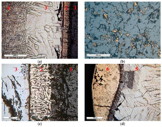 Typical microstructure in individual zones across the cross-section of samples obtained under isothermal holding conditions of CaTiO3/Ti. (a)—zones 1–4 (×50); (b)—zone 1 (×500); (c)—zones 1–3 (×200); (d)—zone 4 (×100), 5—solid solution of oxygen in titanium, 6—TiO.