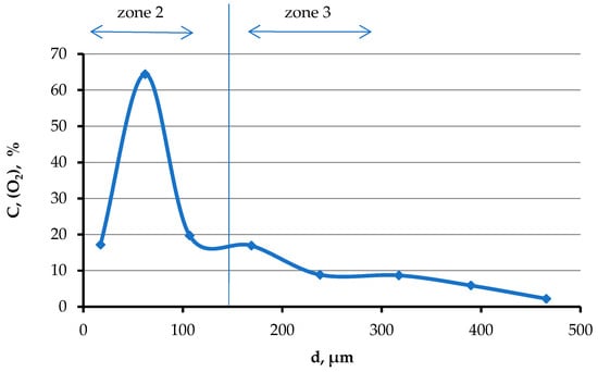 As we approach zone No. 6 at a distance of ≤300 µm, the oxygen concentration in zone No. 5 increases (Figure 15, Table 7, point 5) and directly at the border with zone No. 6 reaches 24.6 mol%.