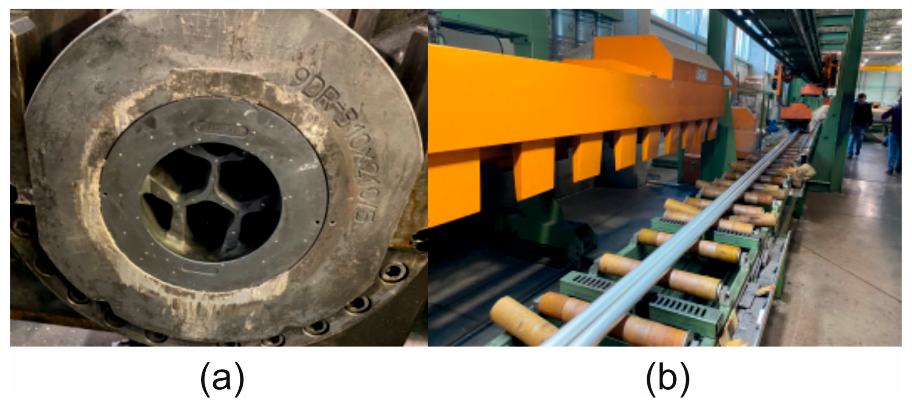 Extrusion of difficult-to-deform AlZnMg(Cu) aluminium alloys is extremely difficult in industrial practice because of the high yield strength of the material under extrusion conditions and its high friction resistance, which leads to high extrusion forces and high stresses acting on the die (strong elastic deflection of the die) and high unevenness of metal flow. As a result, high geometric instability of the extruded product is observed, with dimensional deviations exceeding the permissible limits, and in extreme cases, loss of material cohesion and numerous surface cracks in the product.