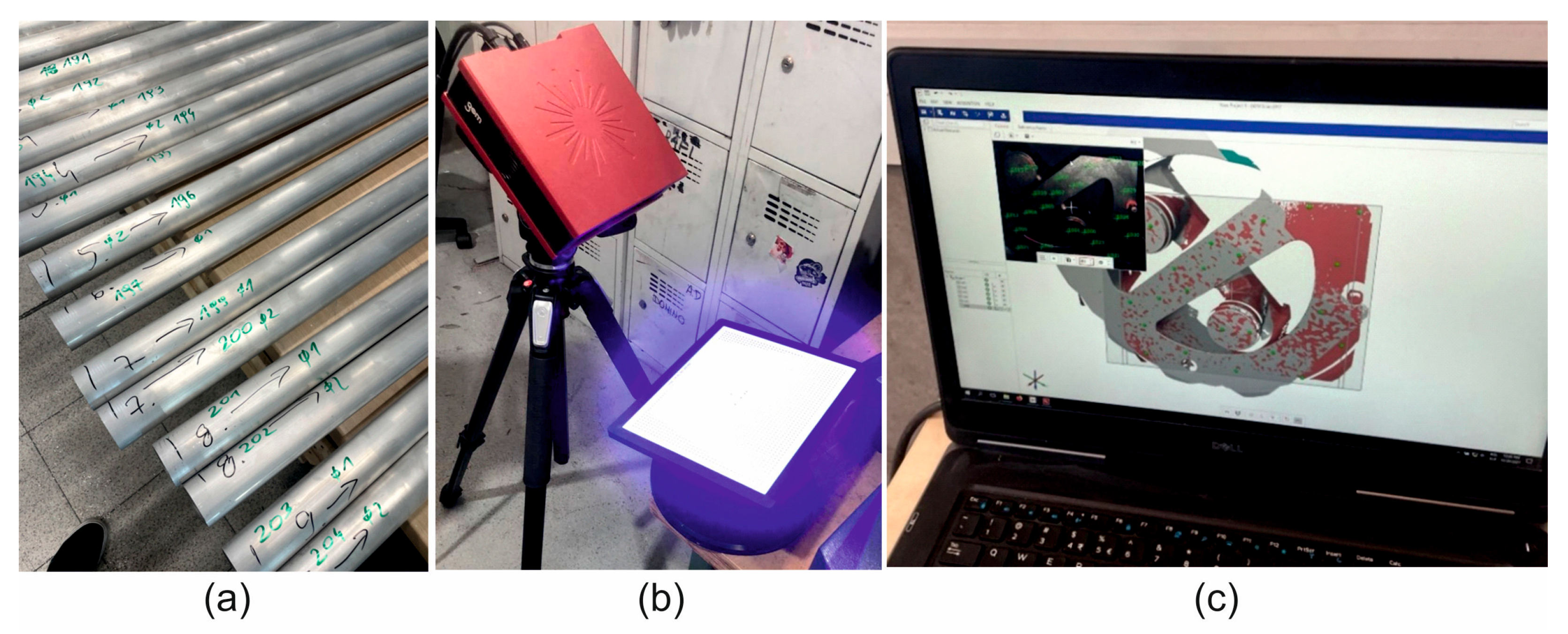 Figure 25, the comparison of wall thickness deviations was presented (industrial extrusion process and FEM numerical calculations) for tubes Ø50 × 3 mm extruded from 7075 aluminium alloy for a billet heating temperature of 480 °C. In general, a high degree of convergence was found in the distribution of wall thickness deviations around the circumference of the tubes in question for the results of numerical FEM calculations, regardless of the material model used, and for the data obtained from 3D optical scanning of tubes extruded under industrial conditions. However, in terms of the maximum wall thickness deviations obtained in reality (positive deviation +0.58 mm and negative deviation −0.25 mm), the closest values are the FEM results for material model no. 2 (positive deviation +0.40 mm and negative deviation −0.29 mm). On the other hand, the very nature of the transition of dimensional deviations in the wall thickness of extruded tubes from positive to negative is most closely reflected by material model no. 3.
